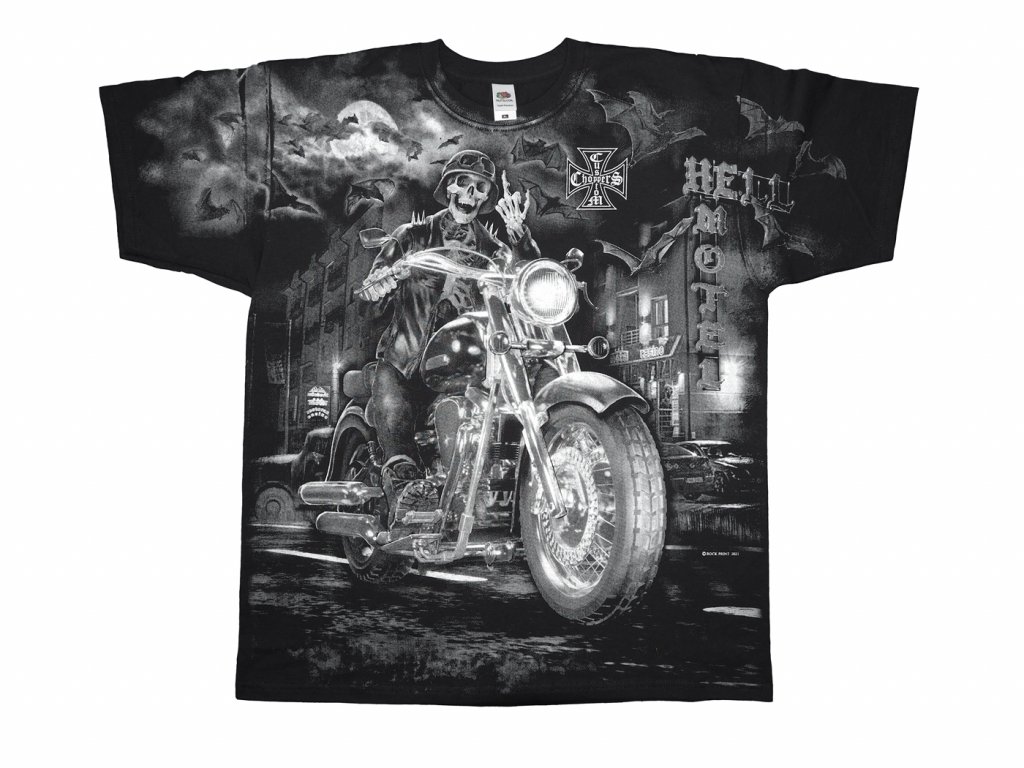 ČERNÉ CHOPPER TRIČKO S POTISKEM JEZDCE U PEKELNÉHO MOTELU