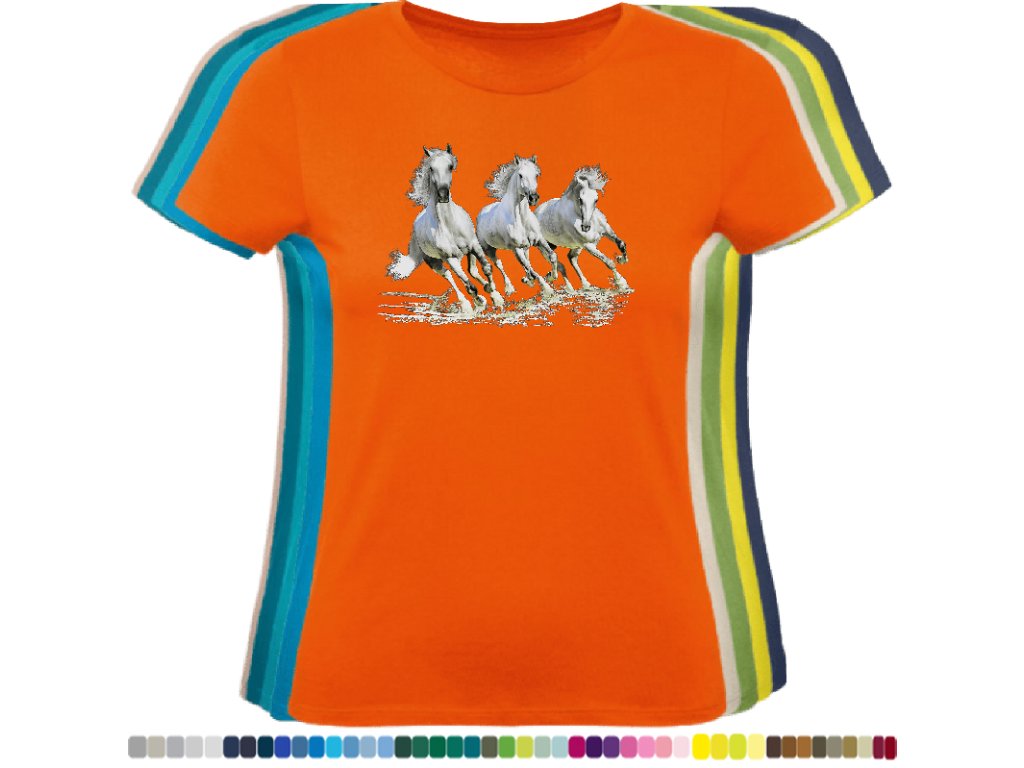 Toto tričko je vyrobeno ze 100 % kvalitní bavlny s pevnou gramáží — pohodlné na nošení a zároveň odolné. Jeho ženský projmutý střih lichotí postavě, obzvlášť ve variantě s klasickým kulatým výstřihem. Na přední straně dominuje výrazný fotografický potisk tří bílých koní v plném cvalu, který symbolizuje svobodu, sílu a eleganci.