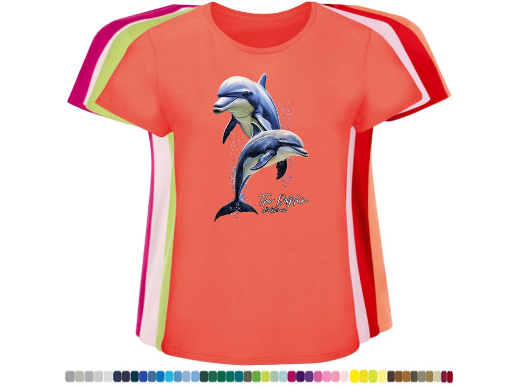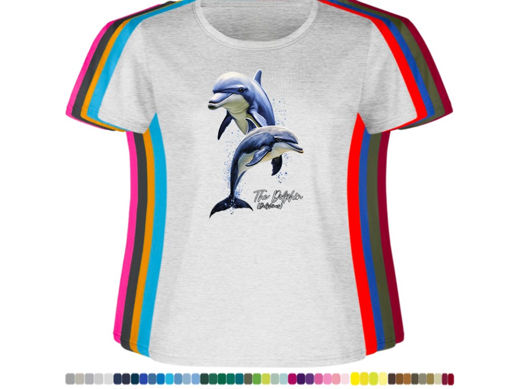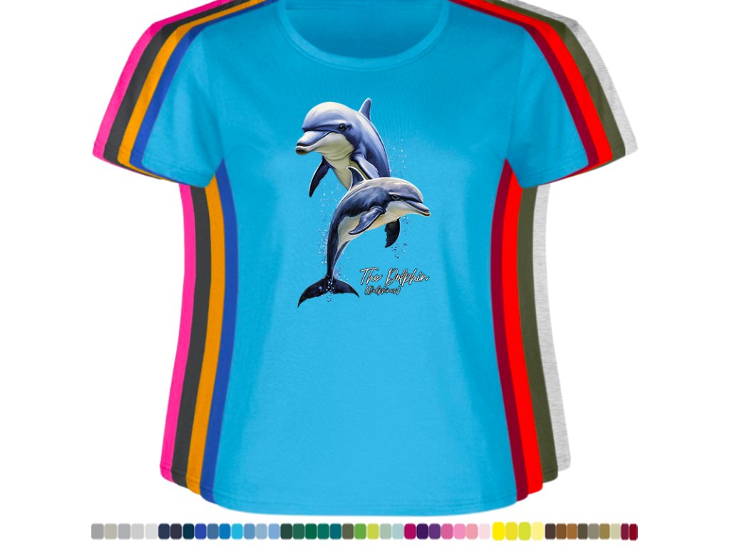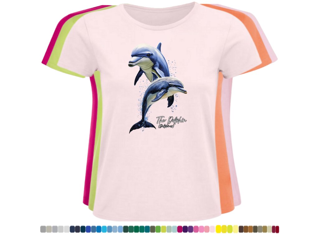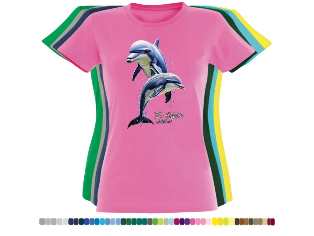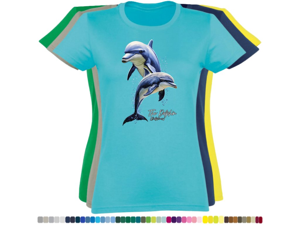 DÁMSKÉ LEVNÉ BAVLNĚNÉ TRIČKO S DIGITÁLNÍM POTISKEM DELFÍNI