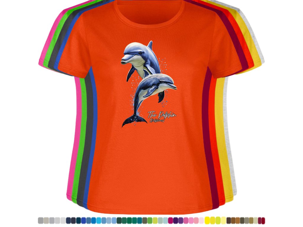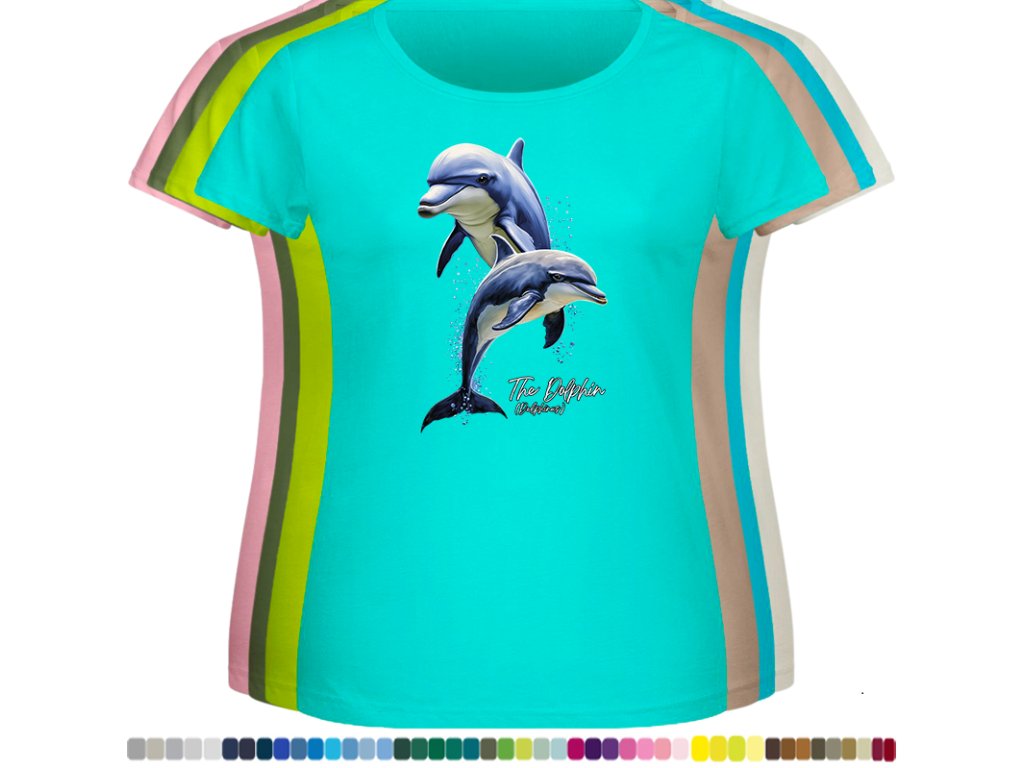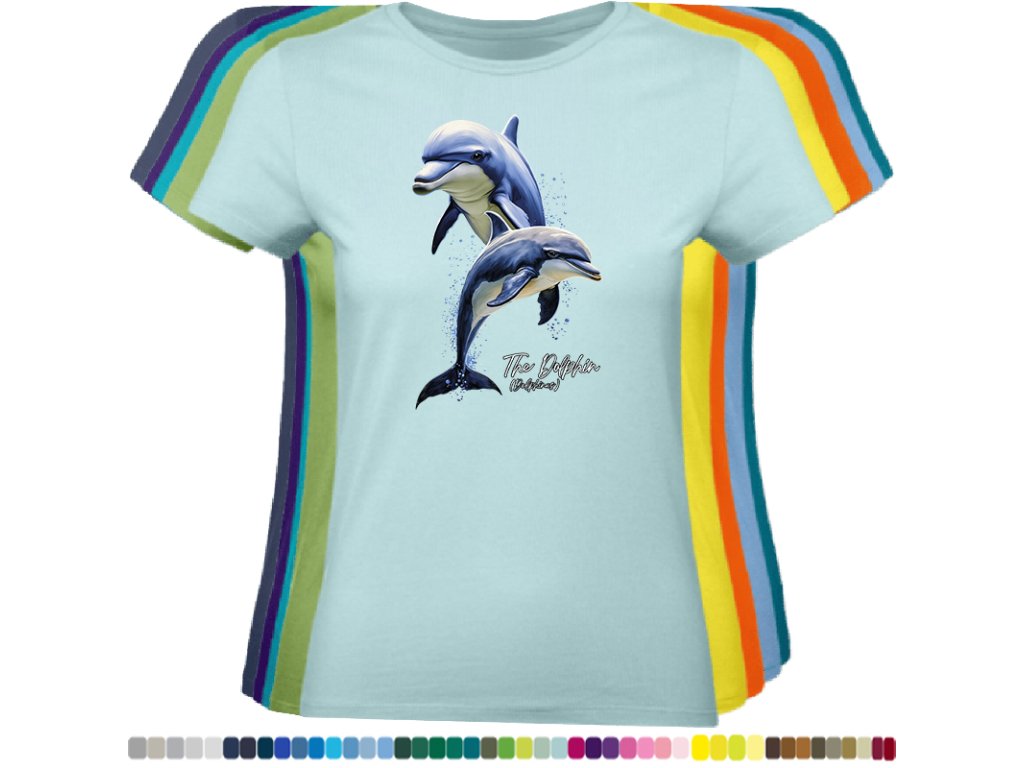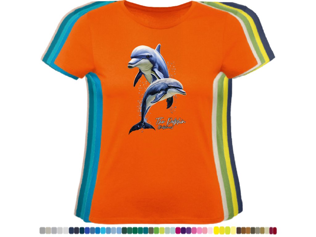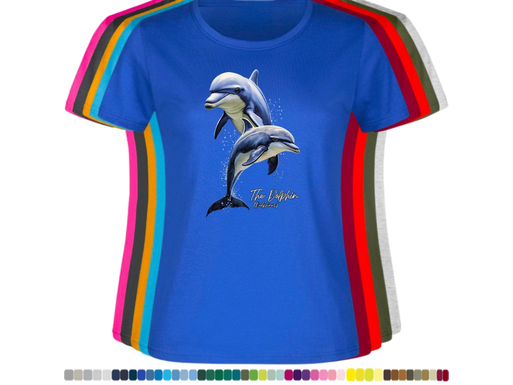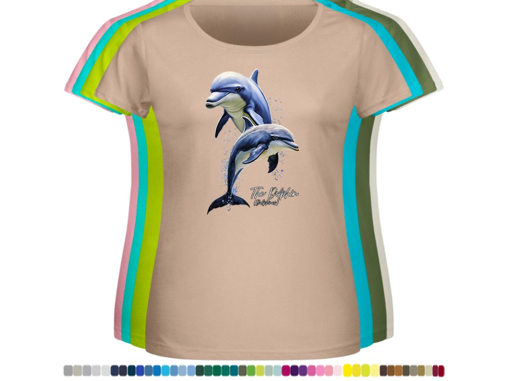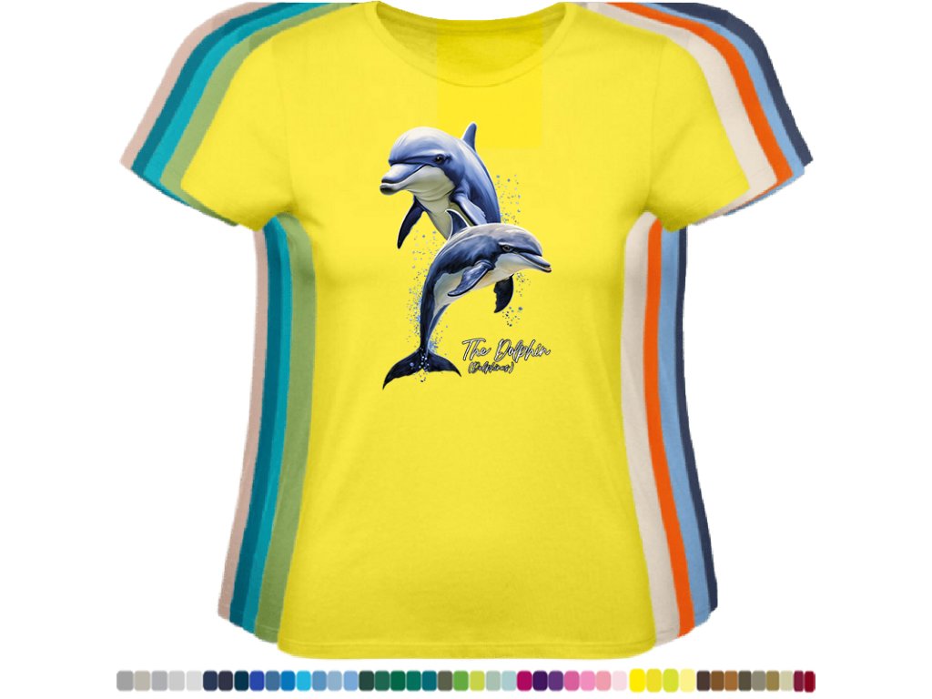 DÁMSKÉ LEVNÉ BAVLNĚNÉ TRIČKO S DIGITÁLNÍM POTISKEM DELFÍNI