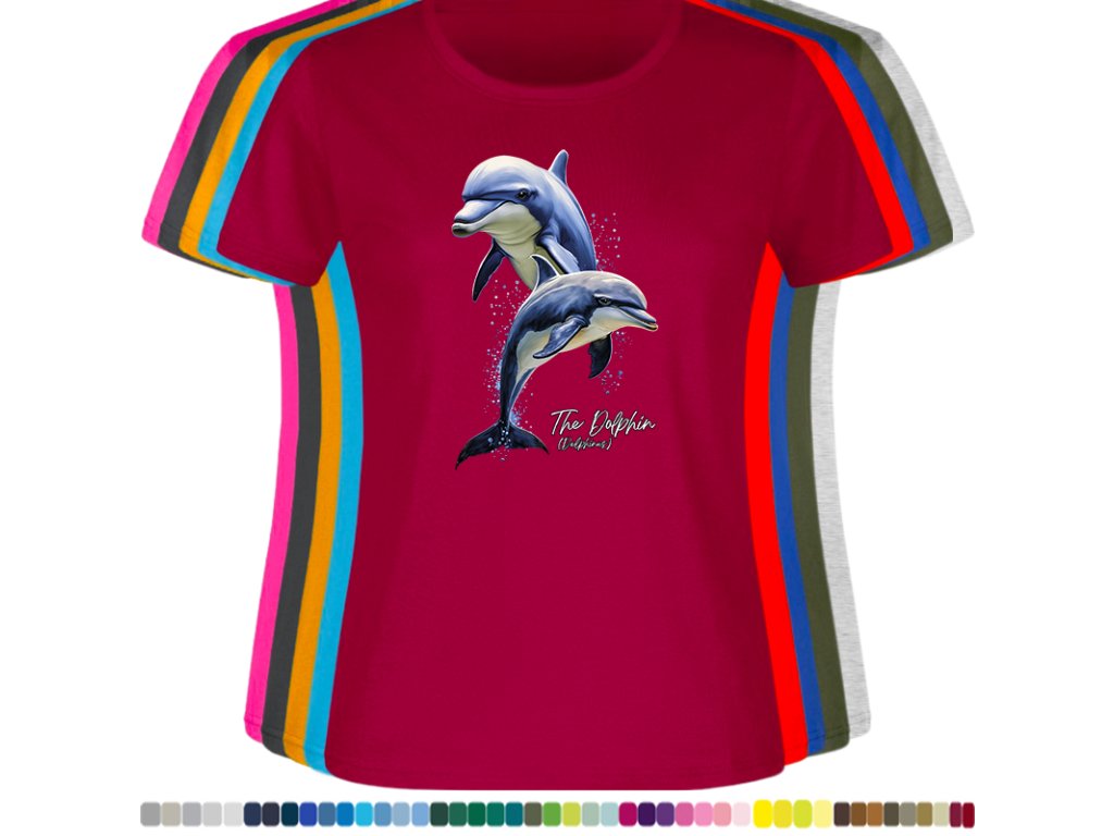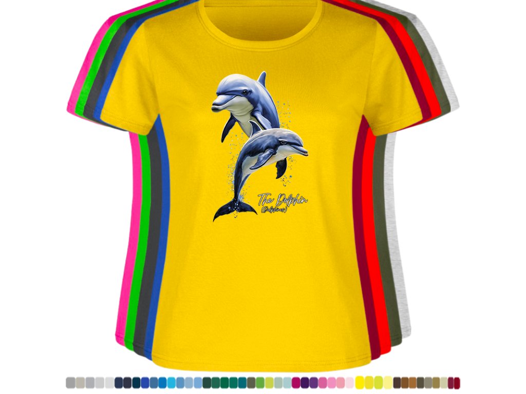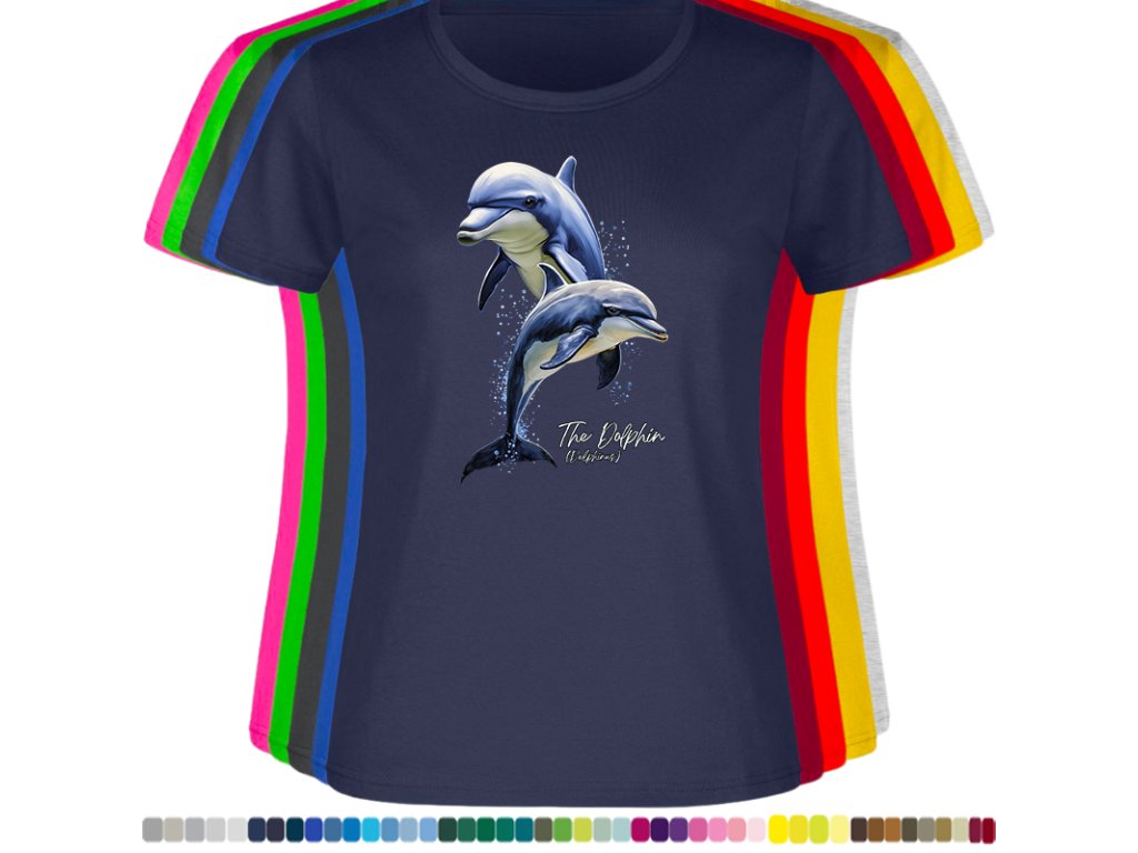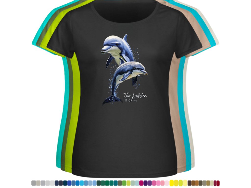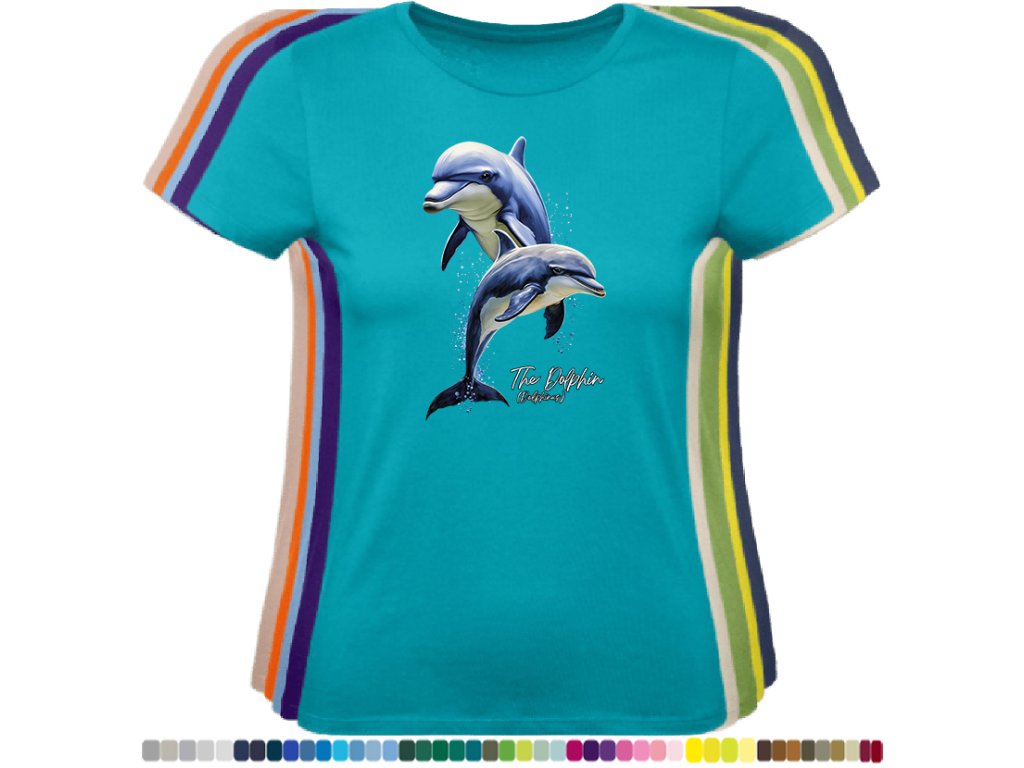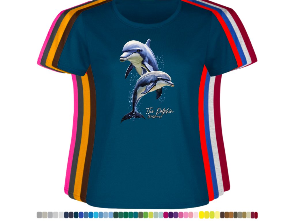 DÁMSKÉ LEVNÉ BAVLNĚNÉ TRIČKO S DIGITÁLNÍM POTISKEM DELFÍNI