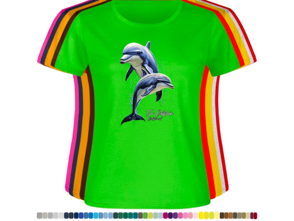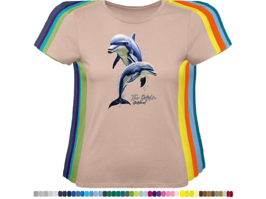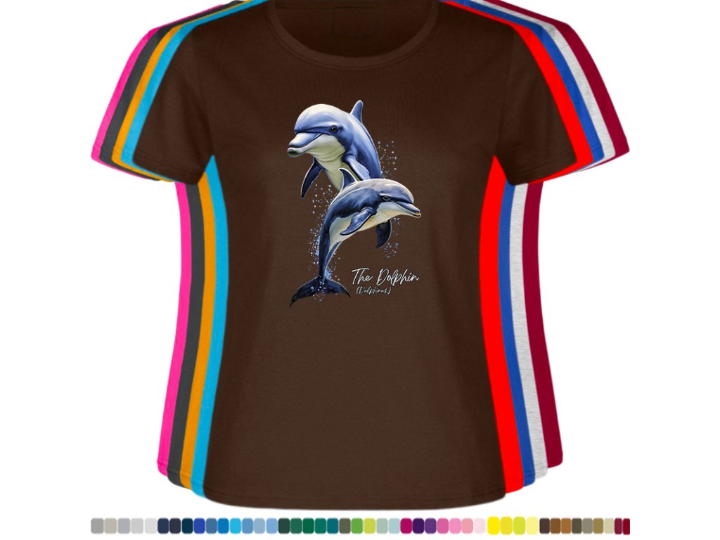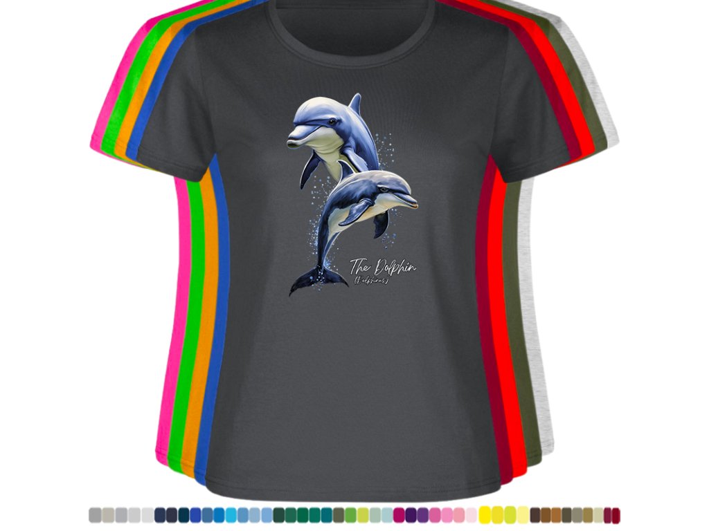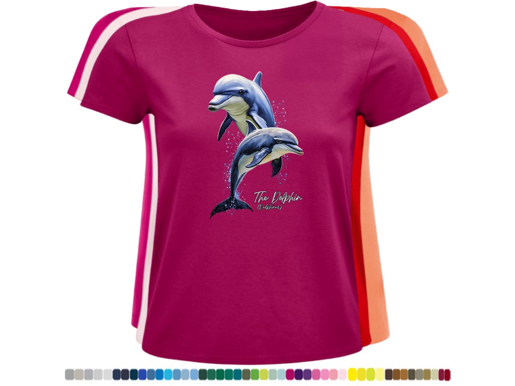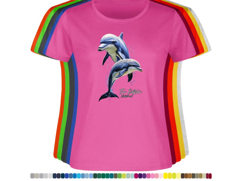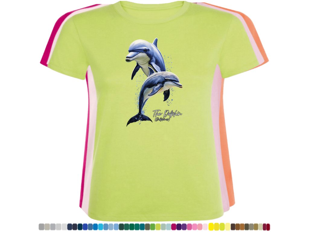 DÁMSKÉ LEVNÉ BAVLNĚNÉ TRIČKO S DIGITÁLNÍM POTISKEM DELFÍNI