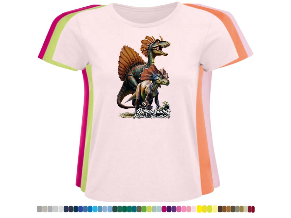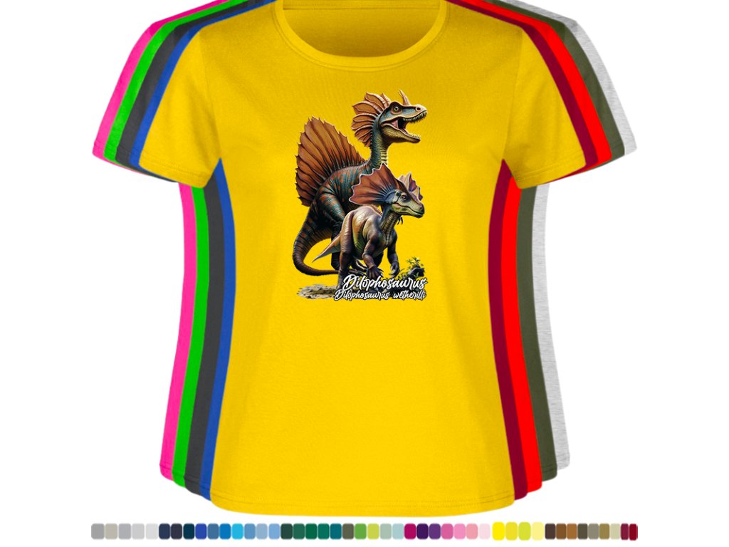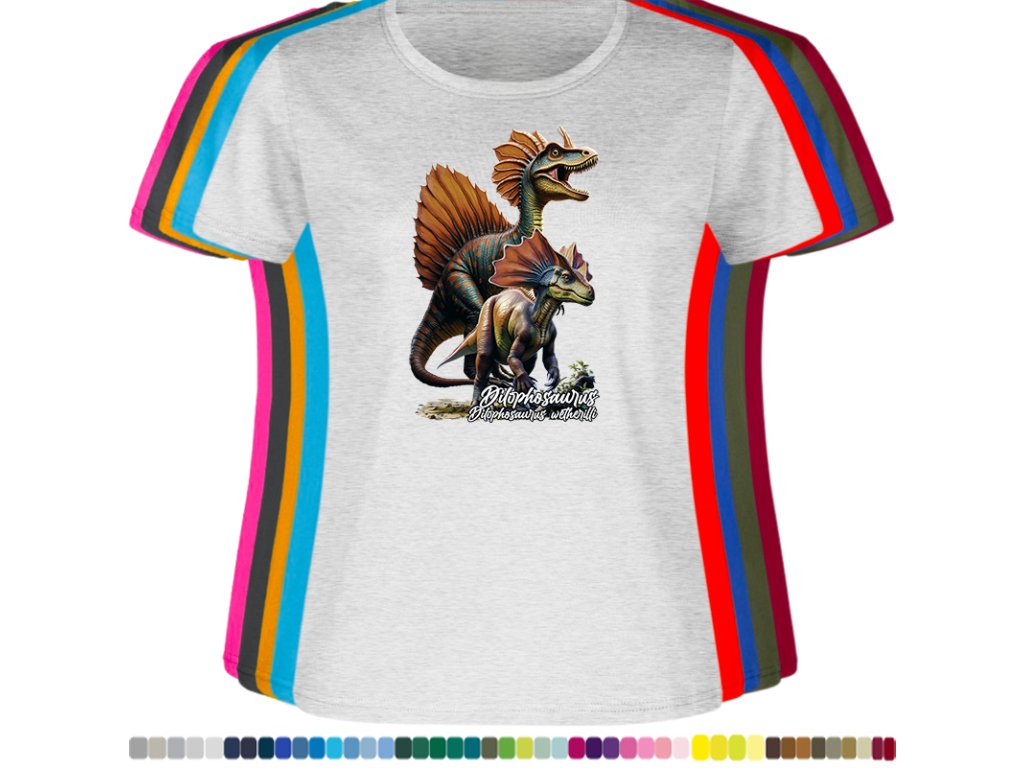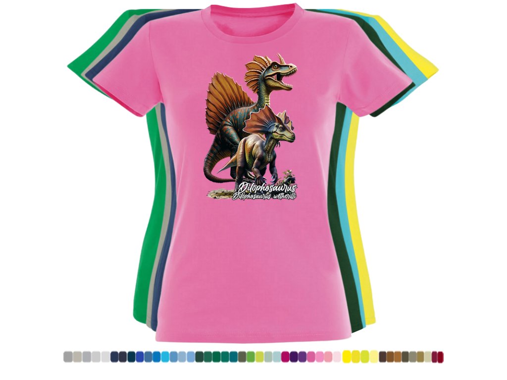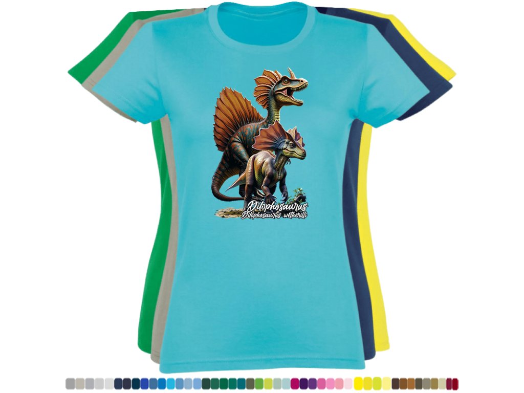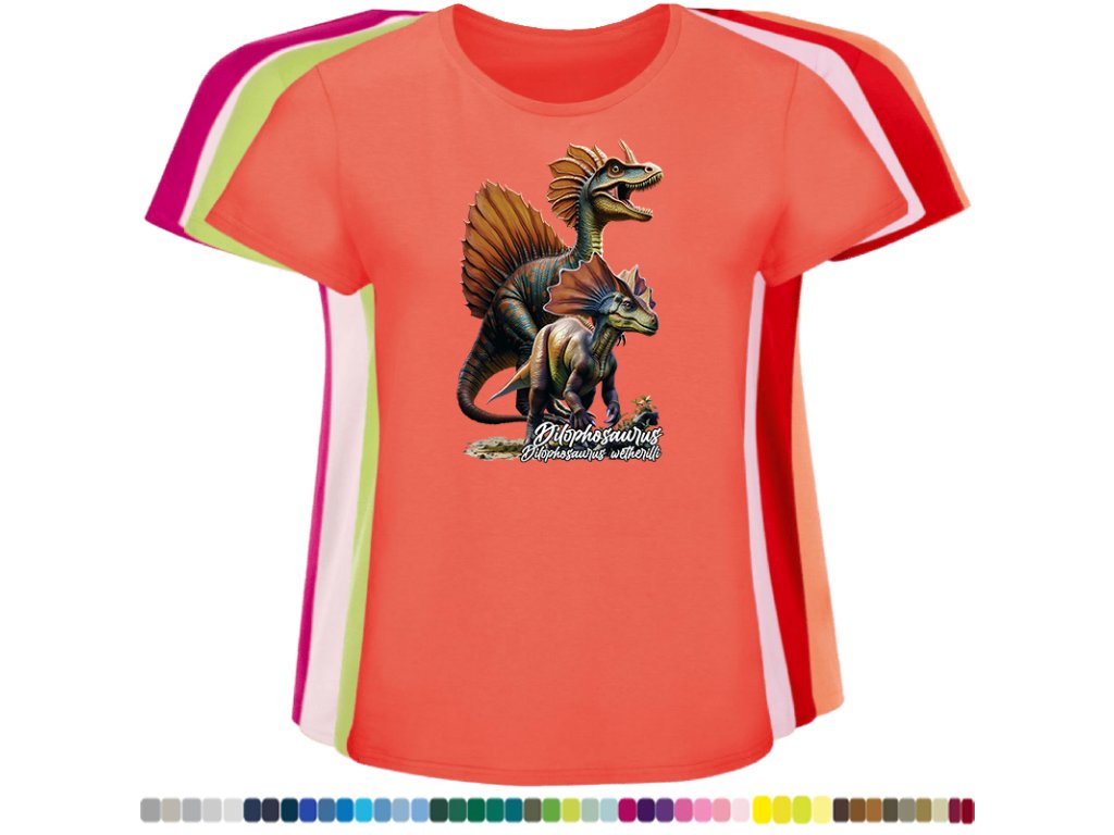 Dámské levné bavlněné tričko s digitálním potiskem Dilophosaurus - dino atlas
