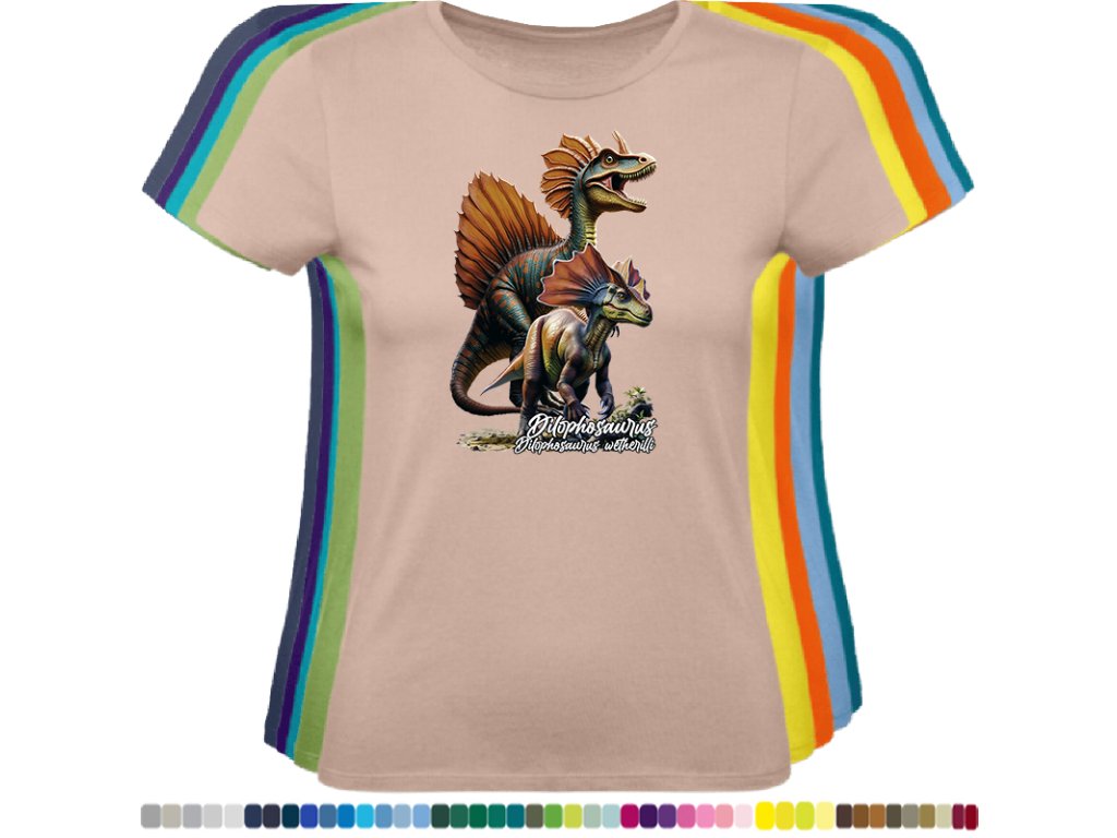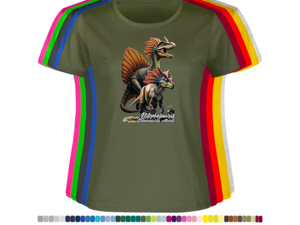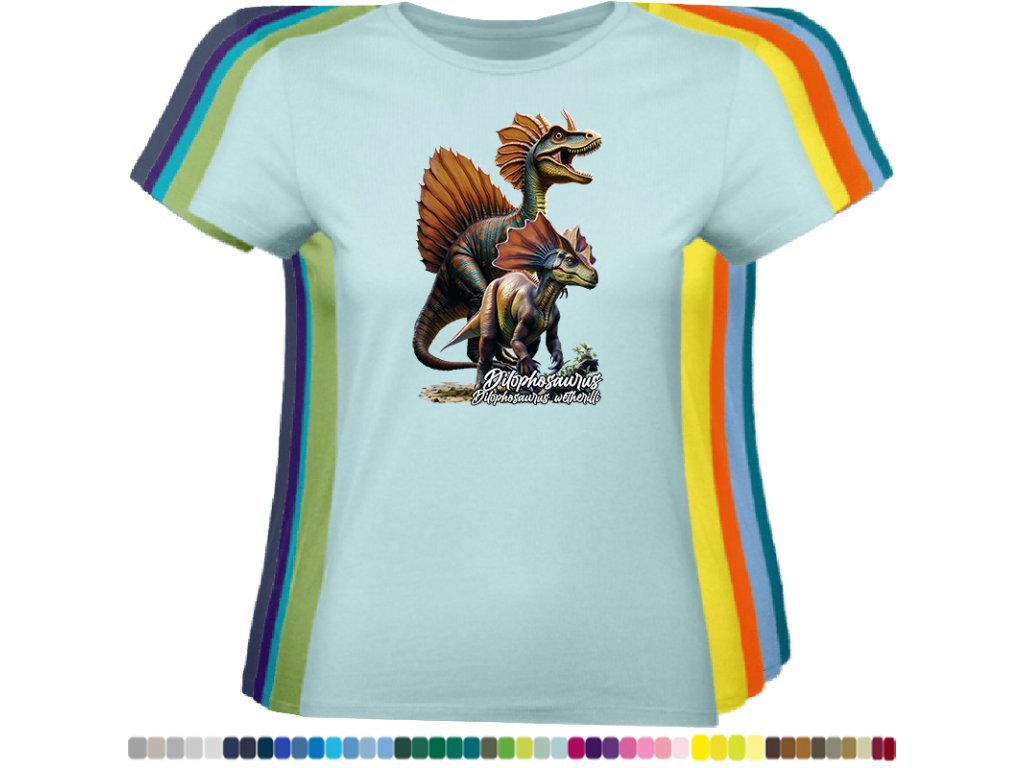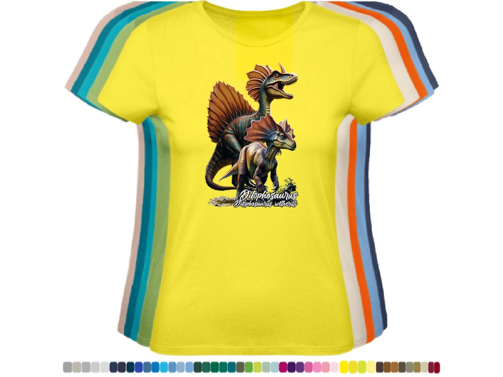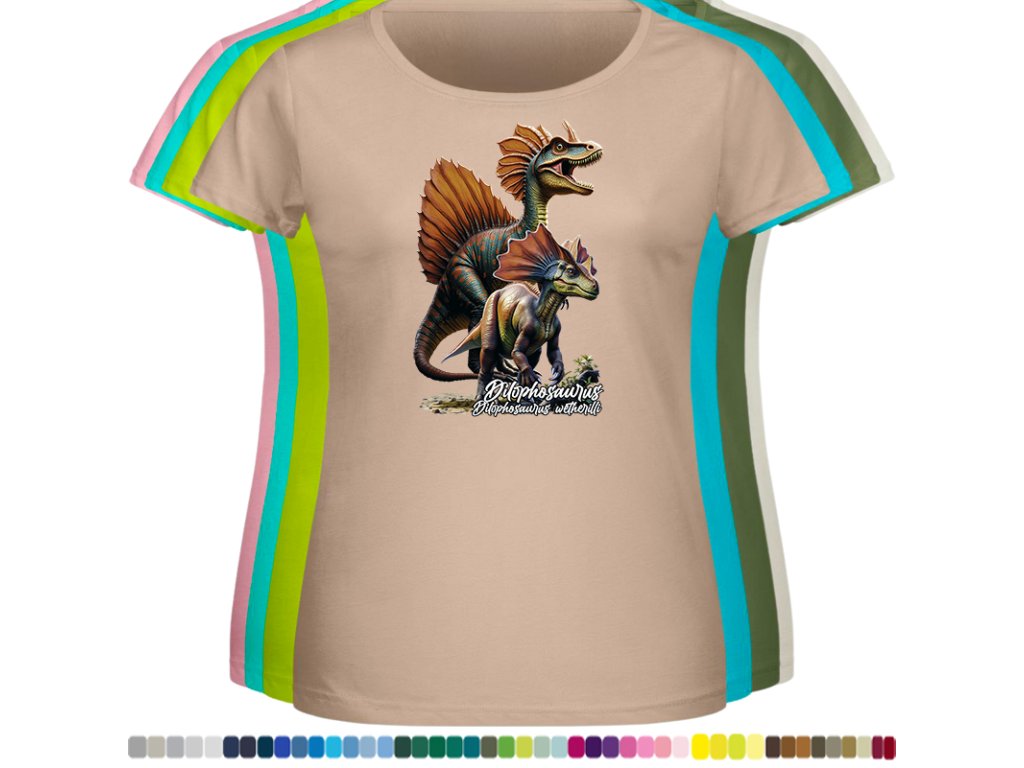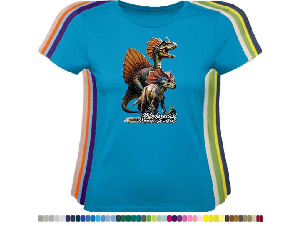 Dámské levné bavlněné tričko s digitálním potiskem Dilophosaurus - dino atlas