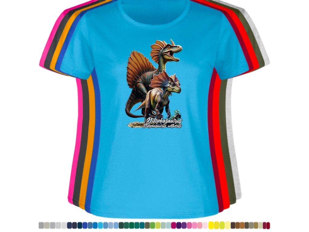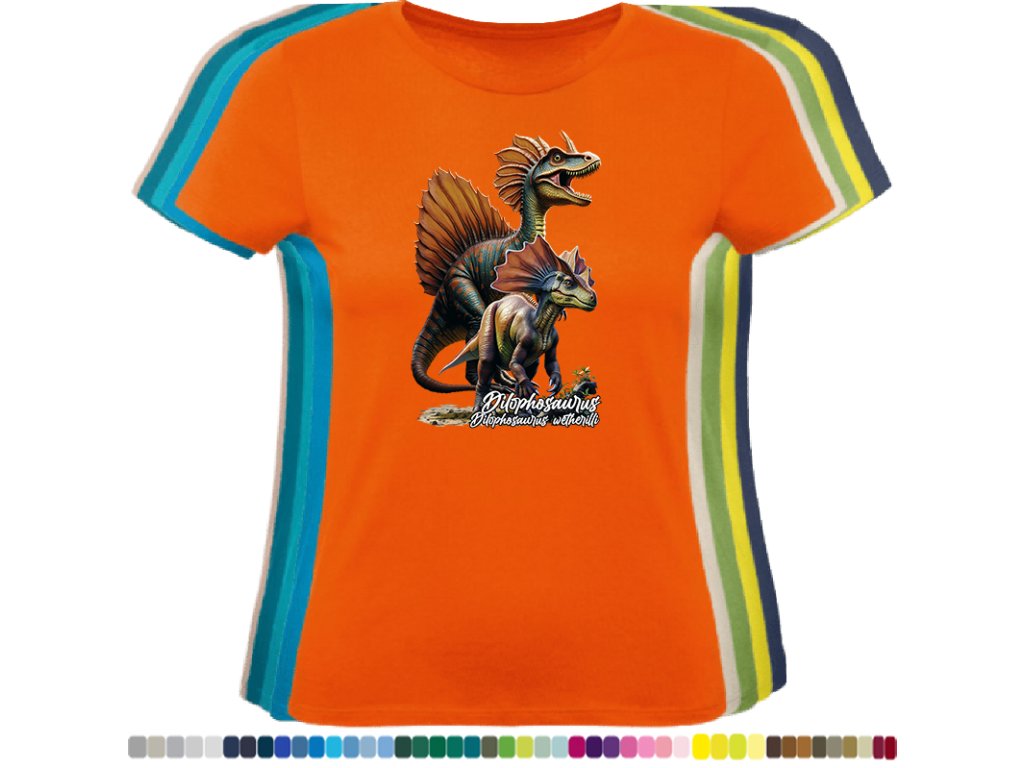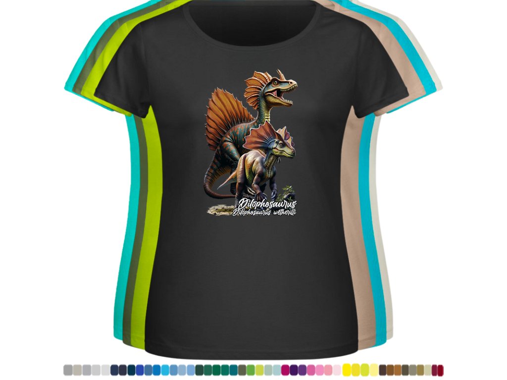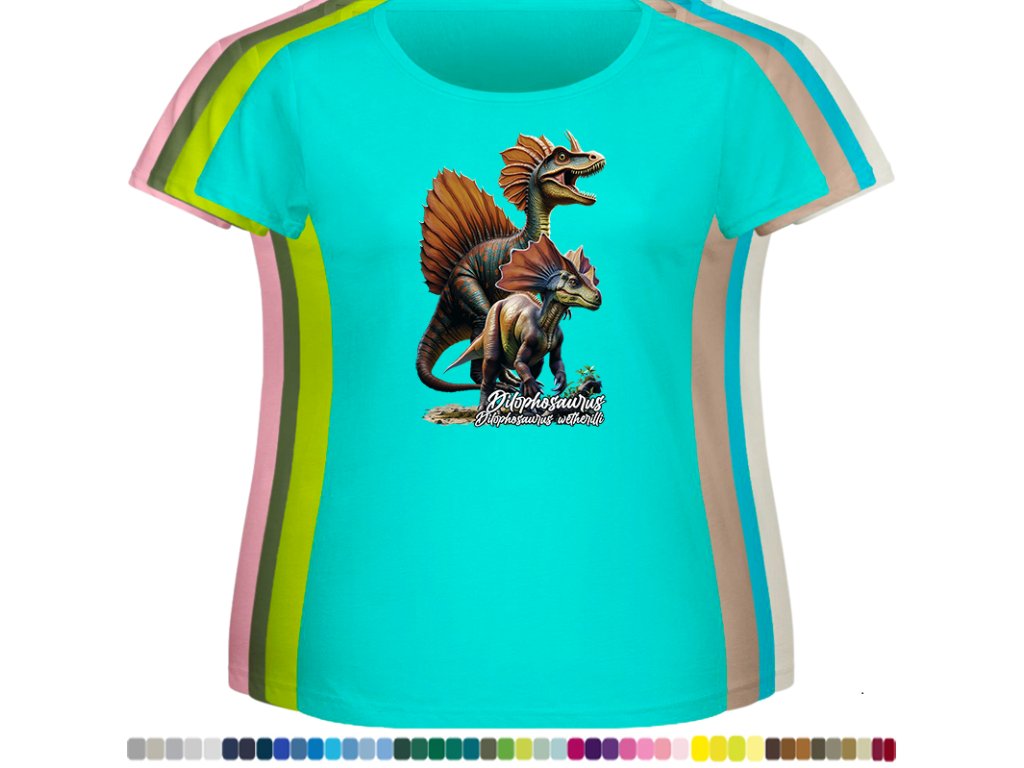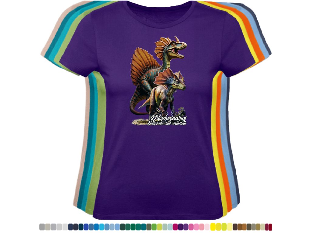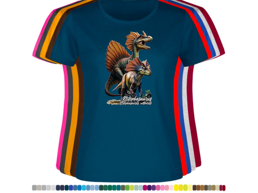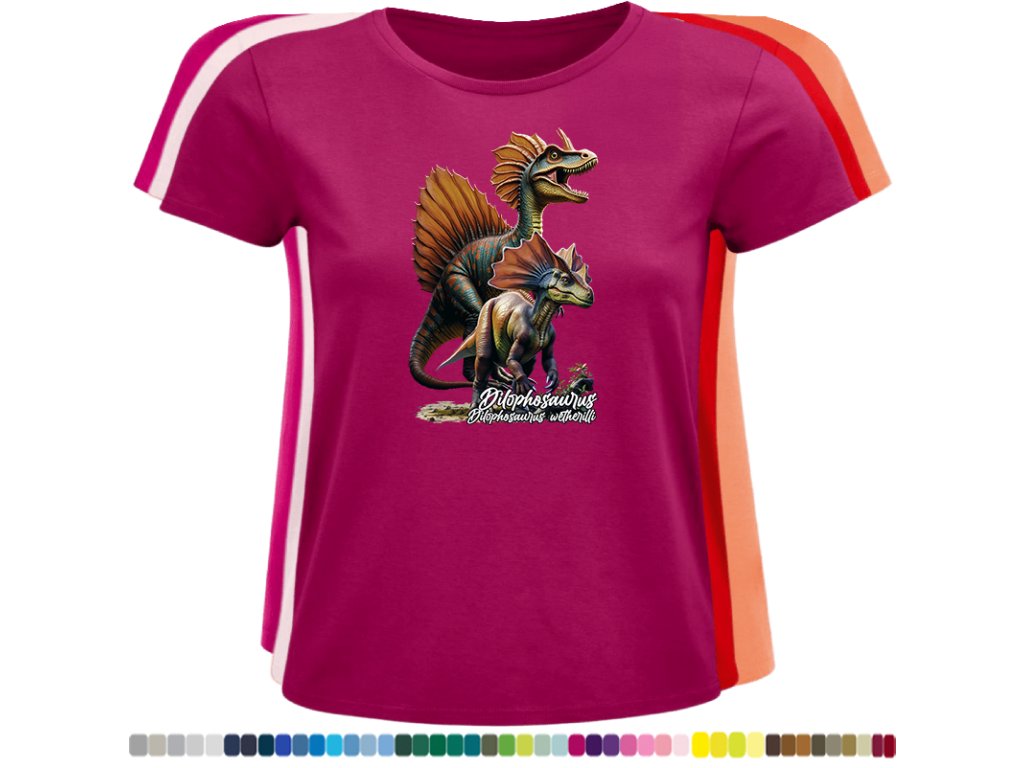 Dámské levné bavlněné tričko s digitálním potiskem Dilophosaurus - dino atlas