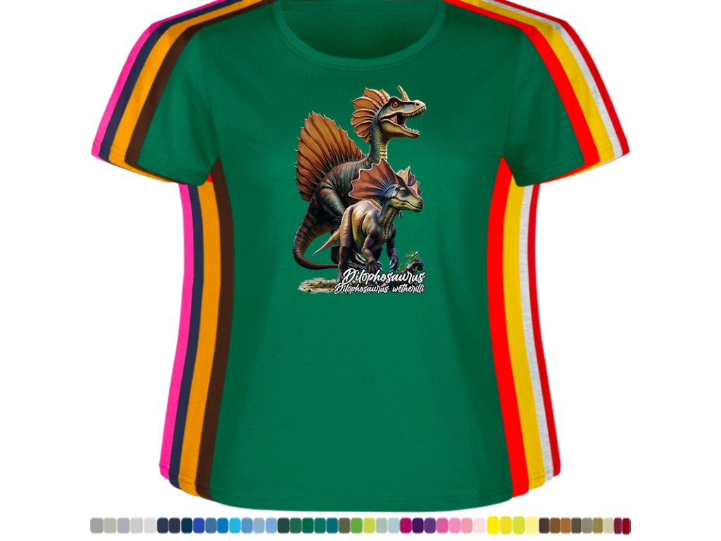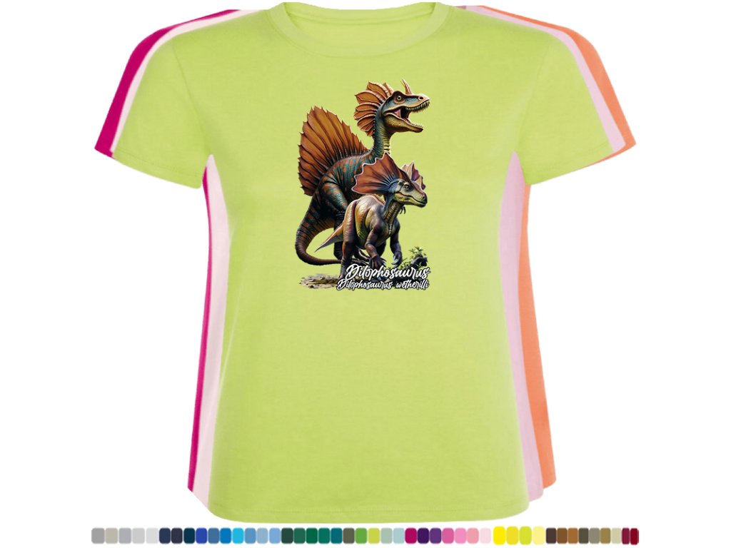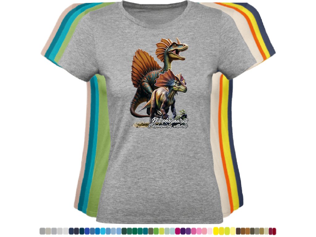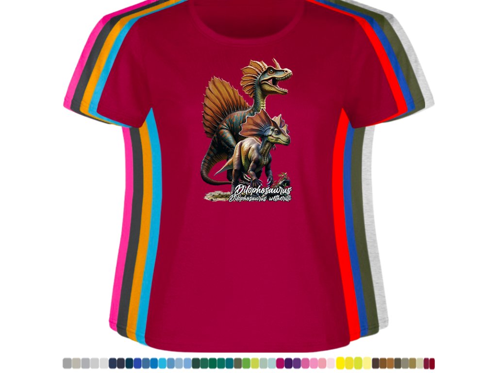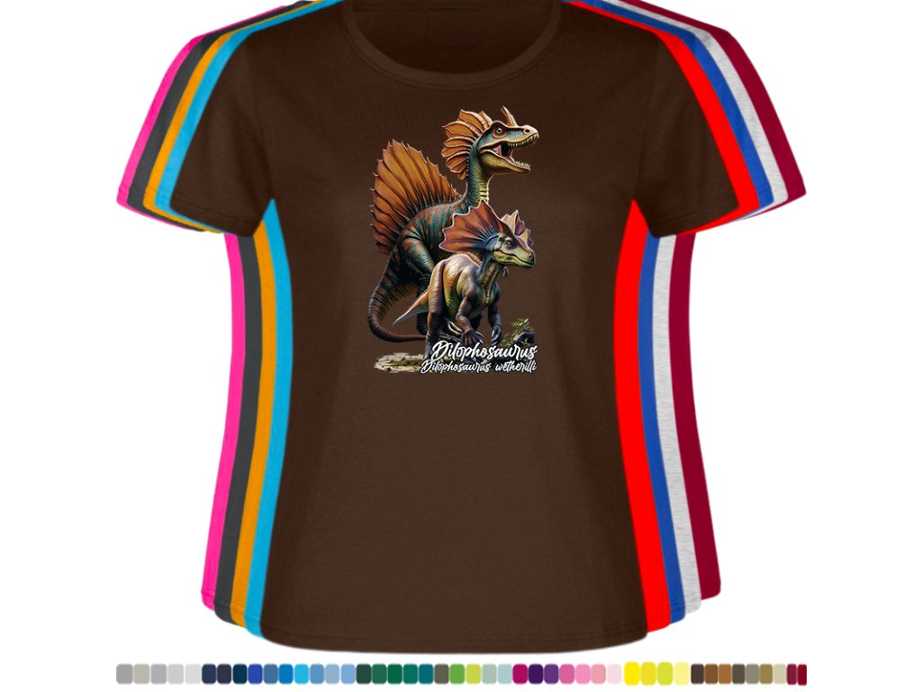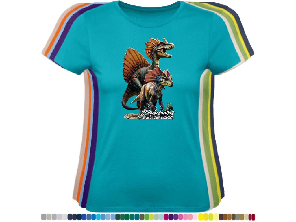 Dámské levné bavlněné tričko s digitálním potiskem Dilophosaurus - dino atlas