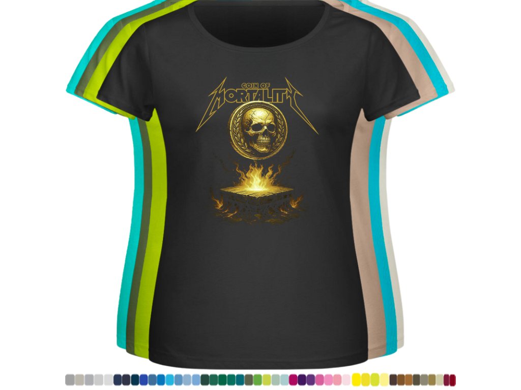 DÁMSKÉ LEVNÉ BAVLNĚNÉ TRIČKO S DIGITÁLNÍM POTISKEM MINCE SMRTI