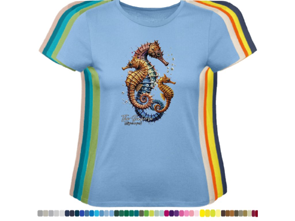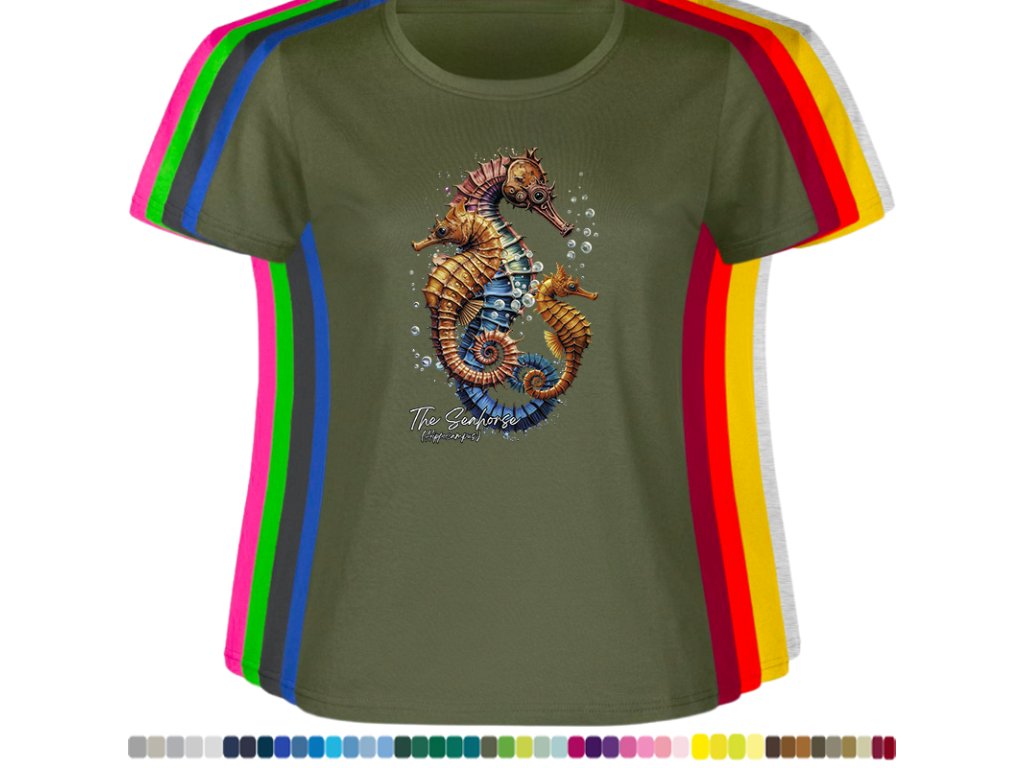 DÁMSKÉ LEVNÉ BAVLNĚNÉ TRIČKO S DIGITÁLNÍM POTISKEM MOŘSKÉHO KONÍKA