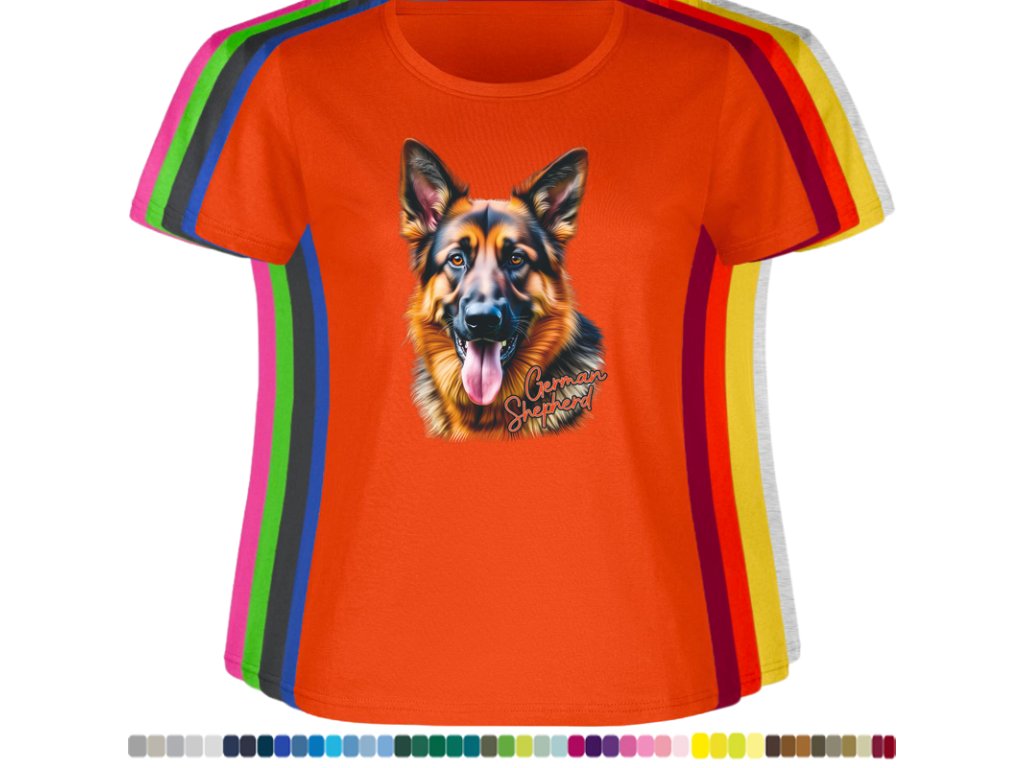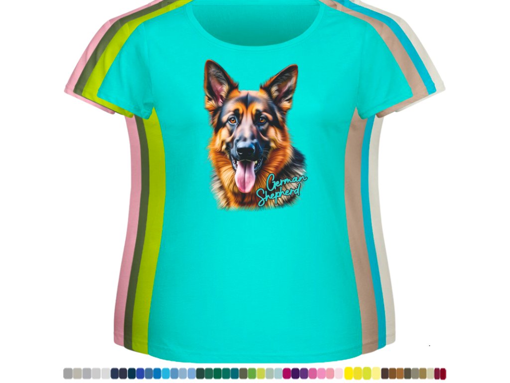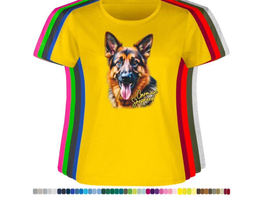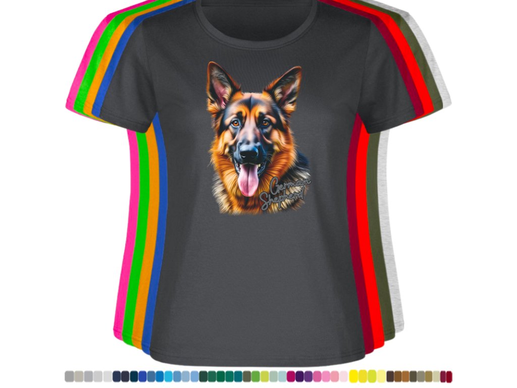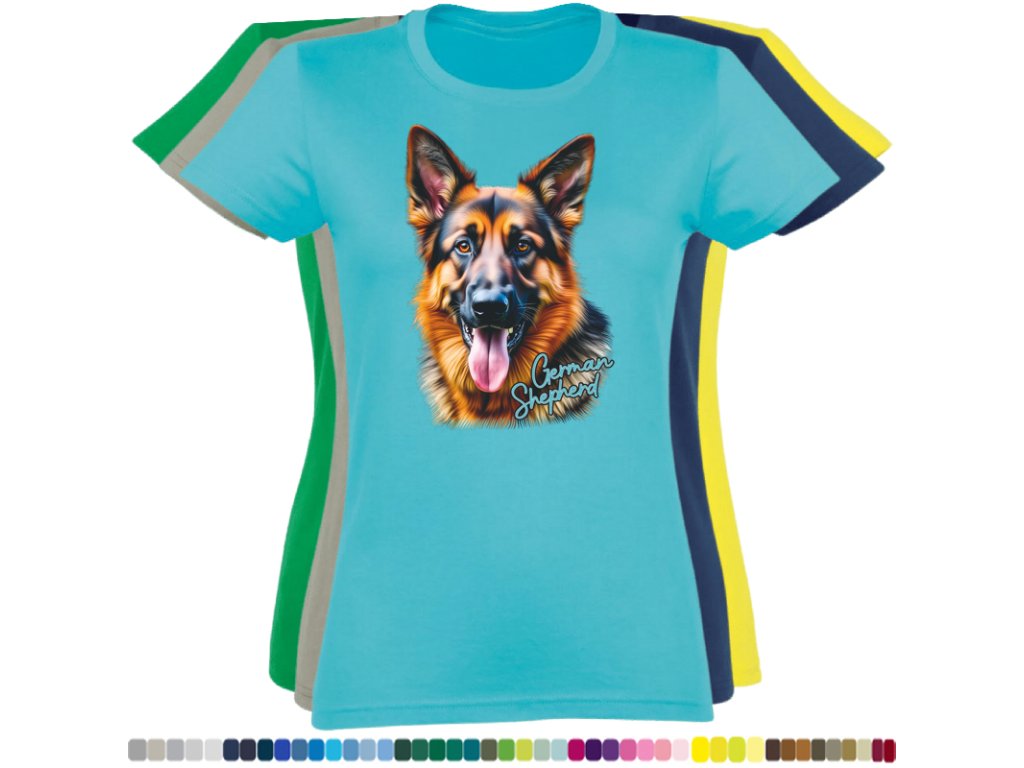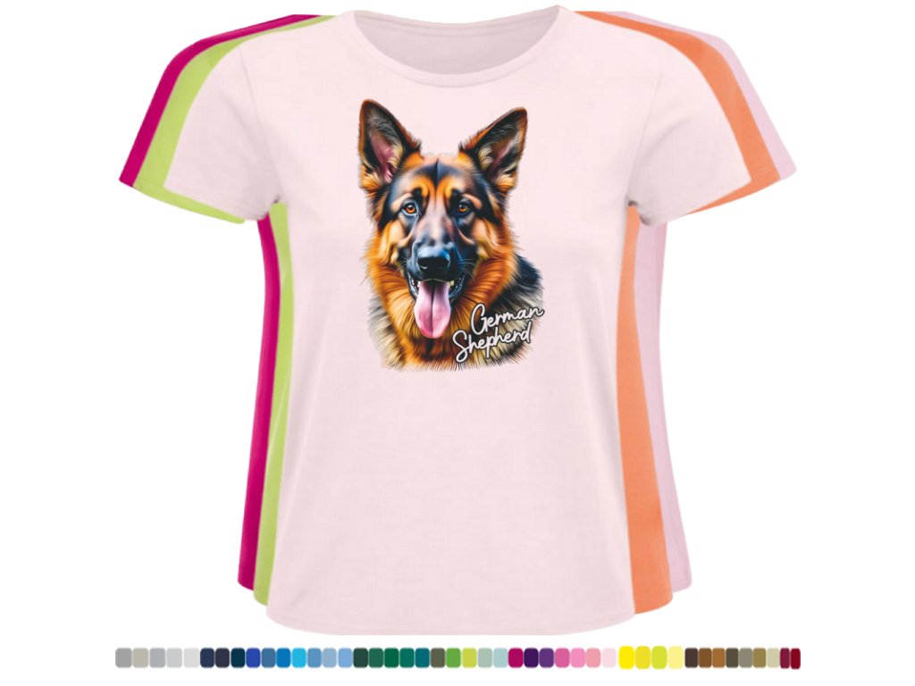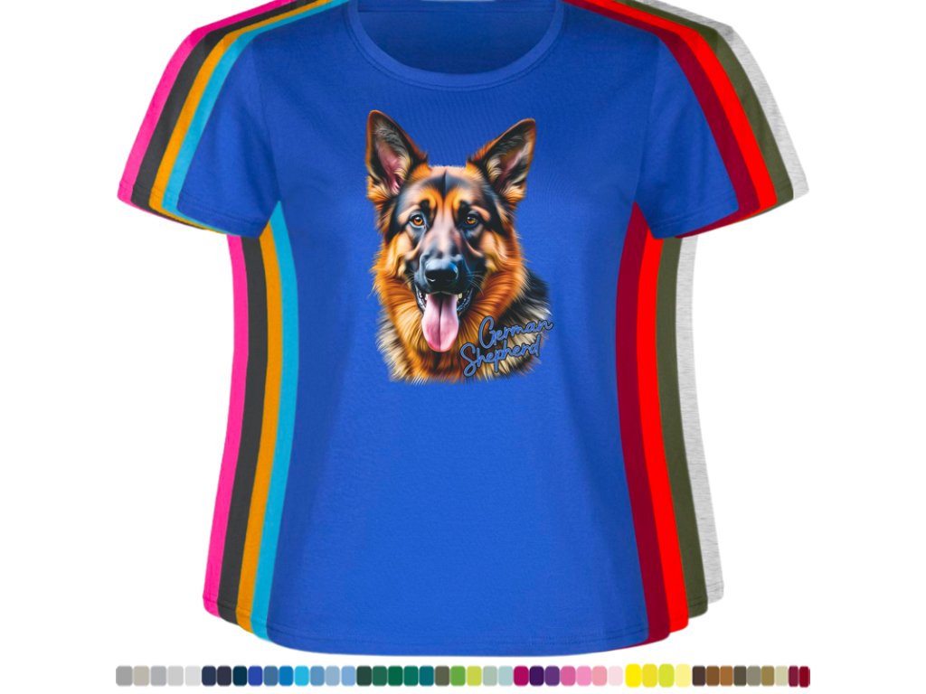 DÁMSKÉ LEVNÉ BAVLNĚNÉ TRIČKO S DIGITÁLNÍM POTISKEM PSA NĚMECKÉHO OVČÁKA