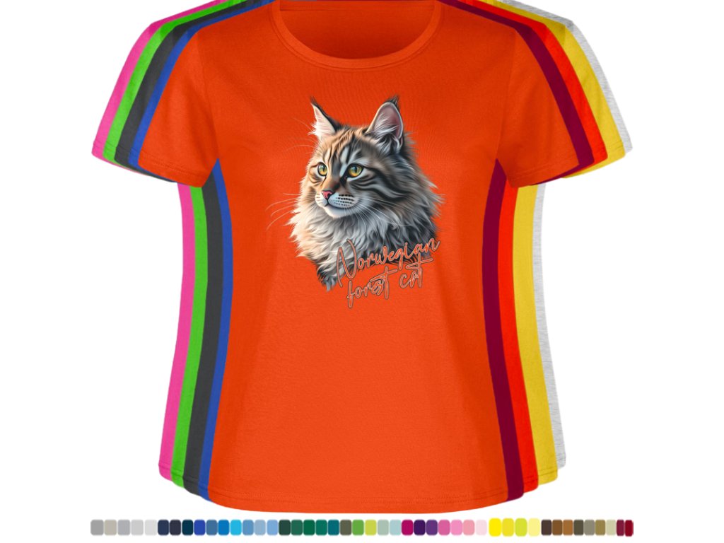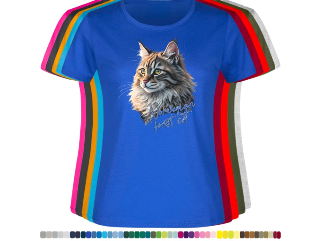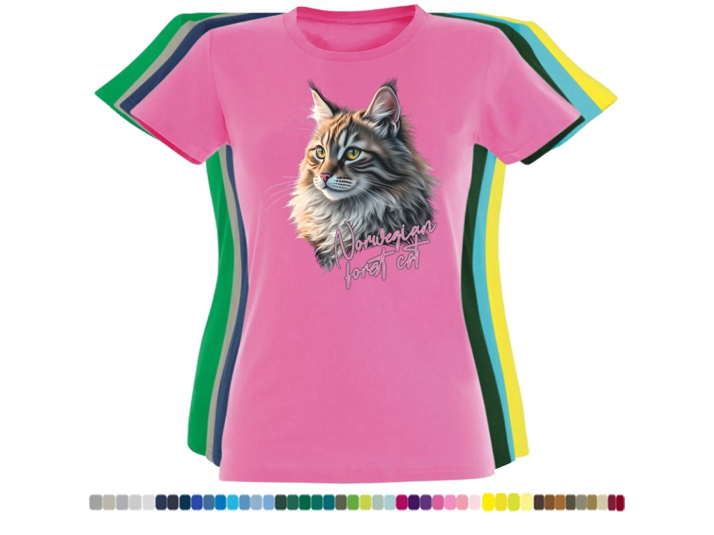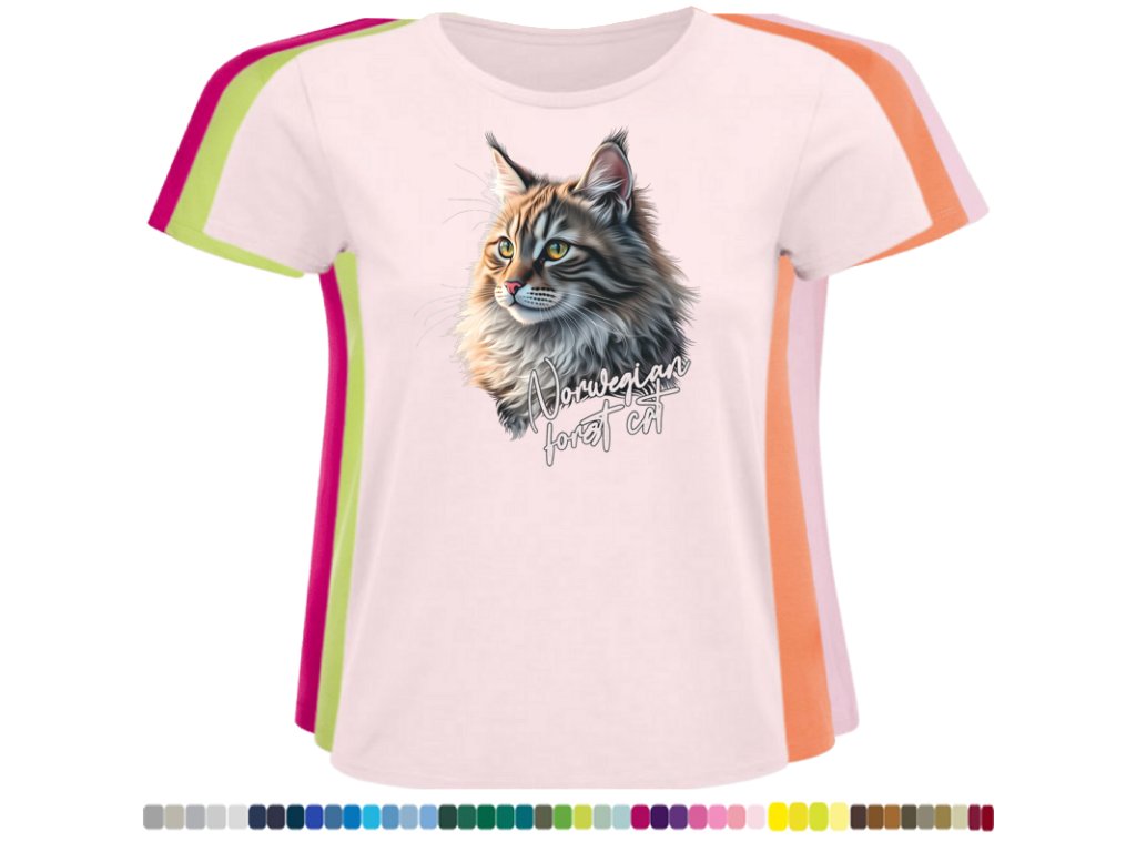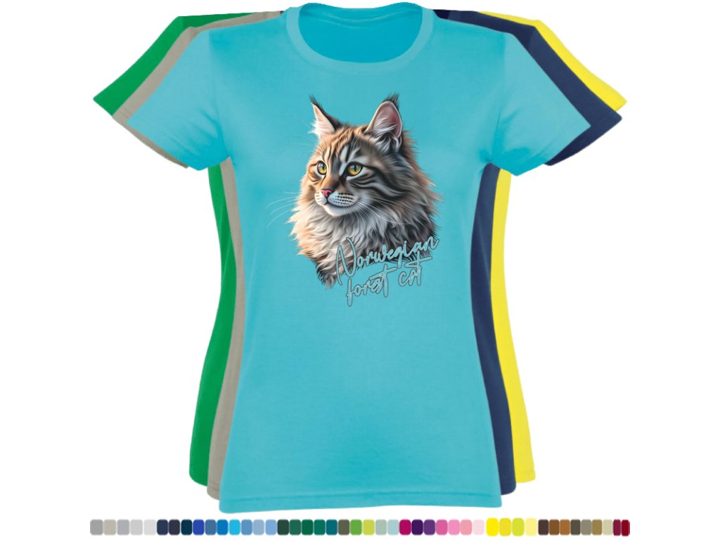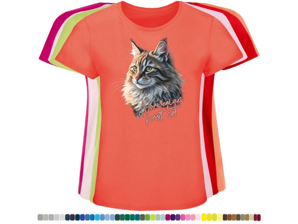 DÁMSKÉ LEVNÉ BAVLNĚNÉ TRIČKO S DIGITÁLNÍM POTISKEM NORSKÉ LESNÍ KOČKY