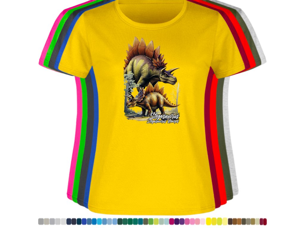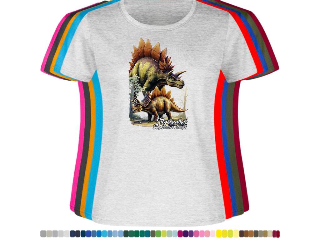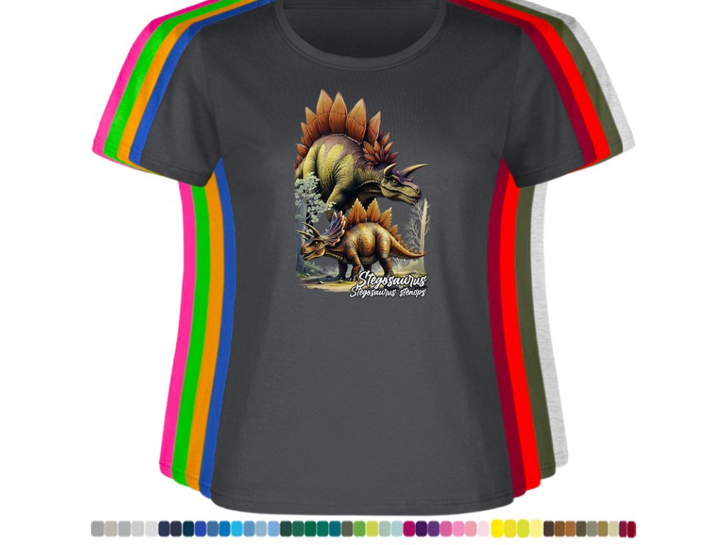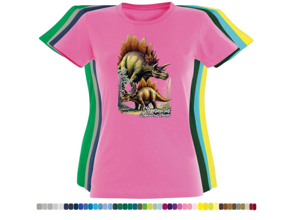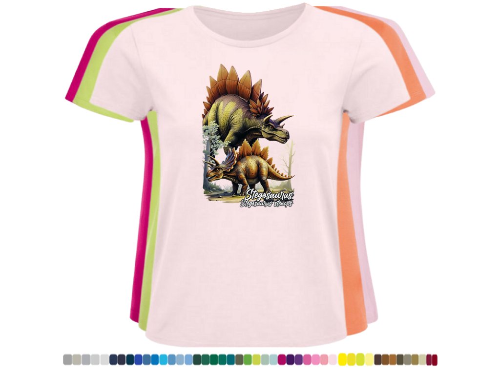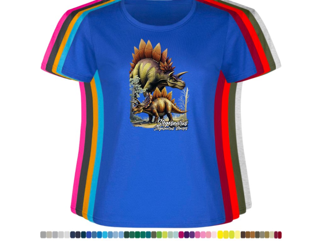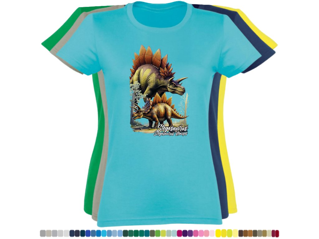 Dámské levné bavlněné tričko s digitálním potiskem Stegosaurus - dino atlas