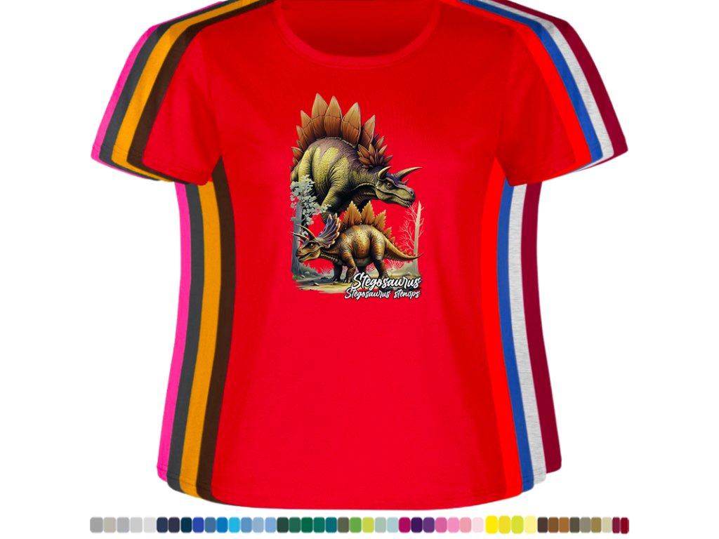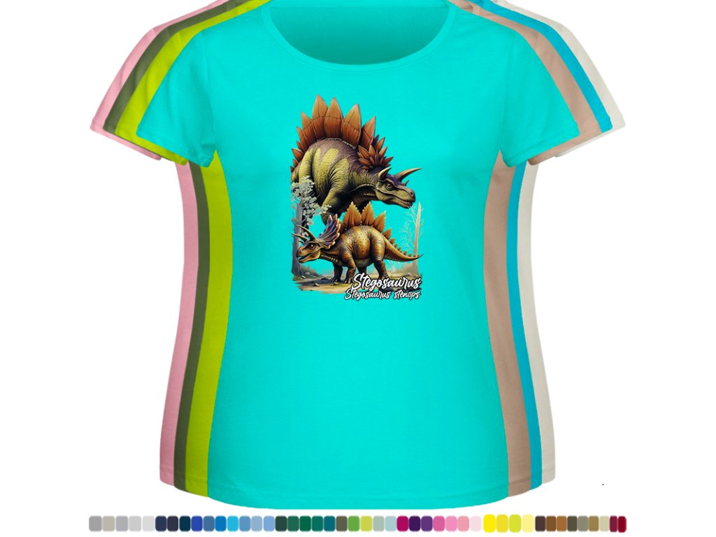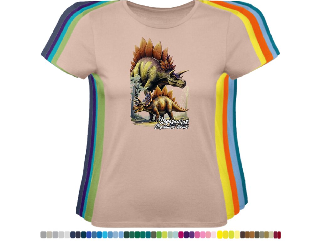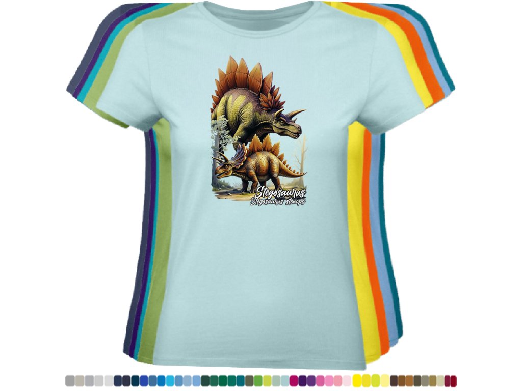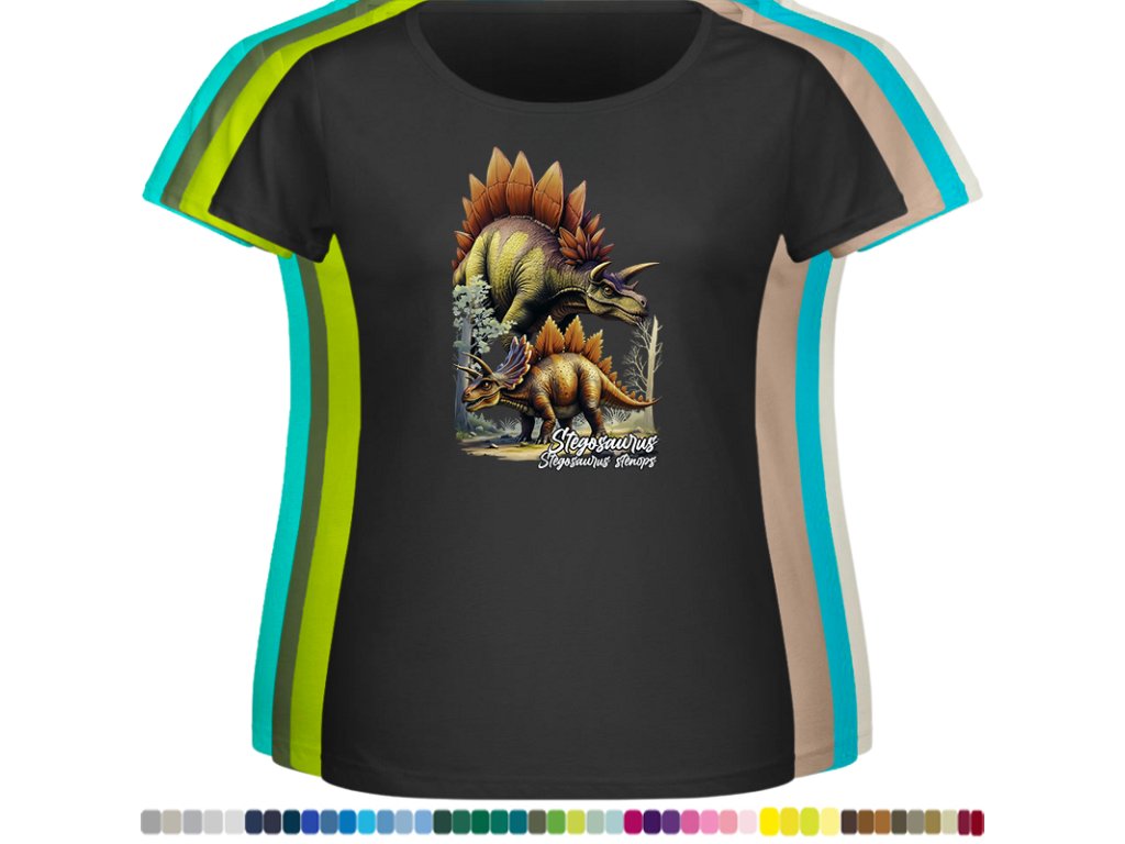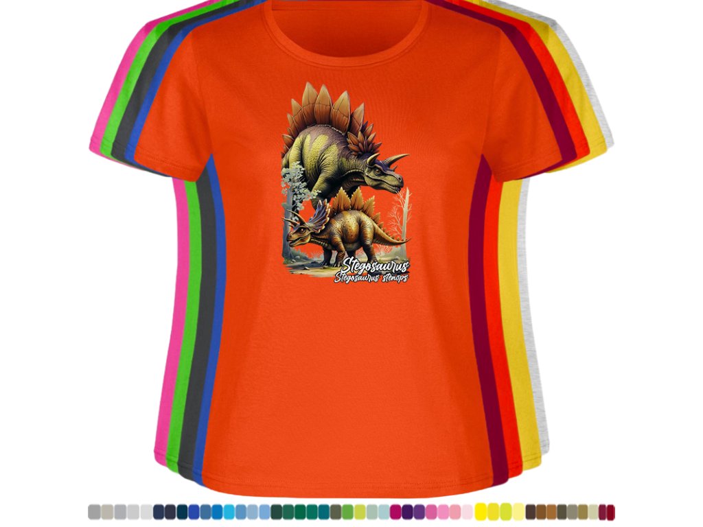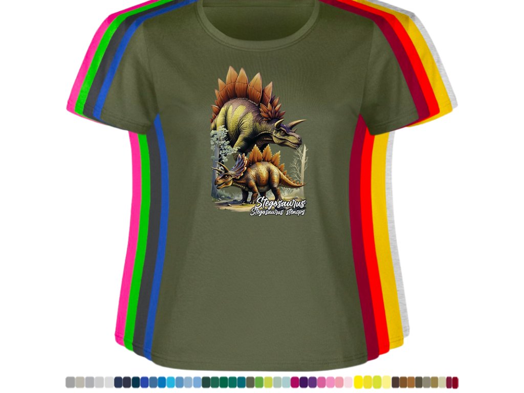 Dámské levné bavlněné tričko s digitálním potiskem Stegosaurus - dino atlas