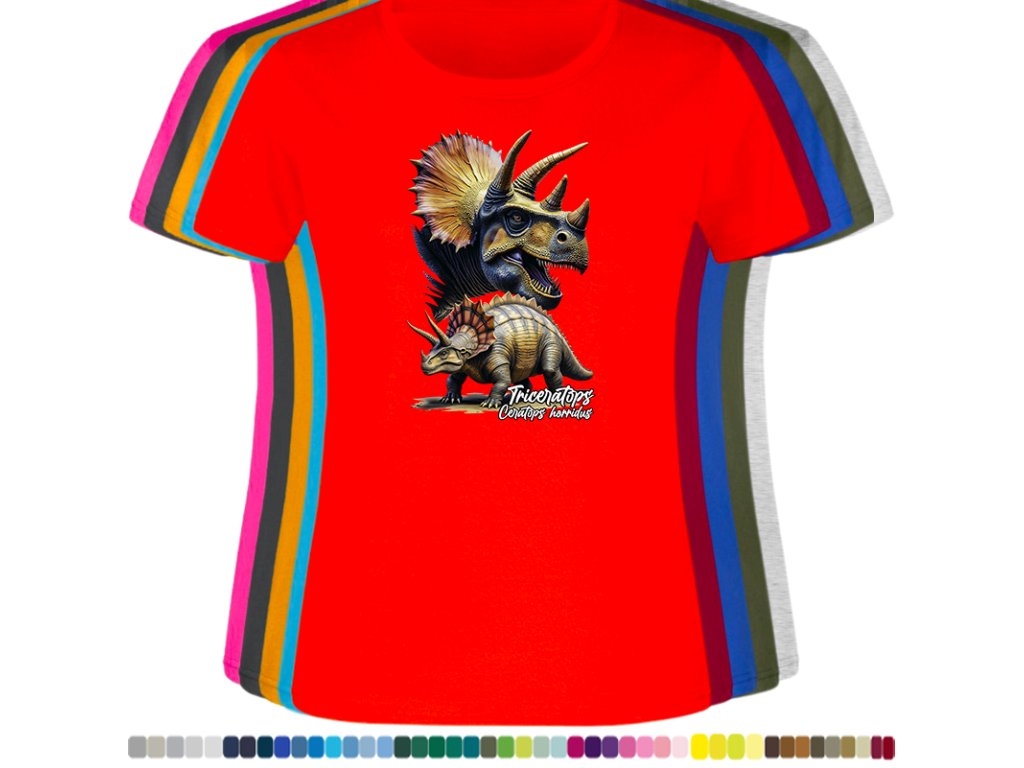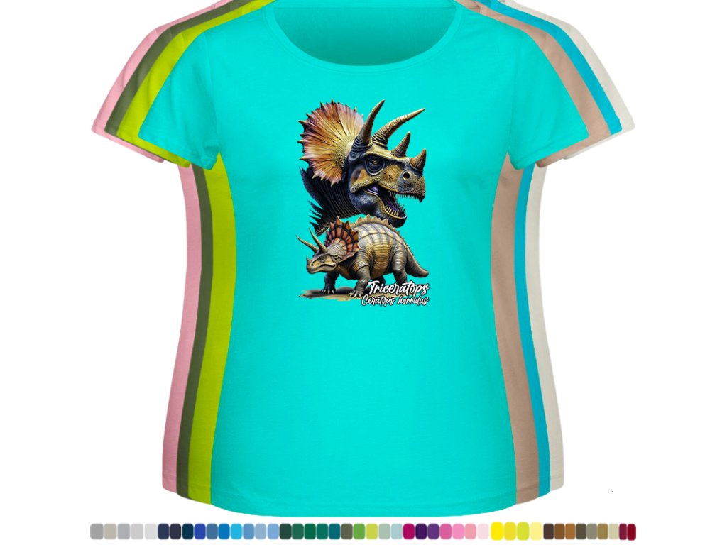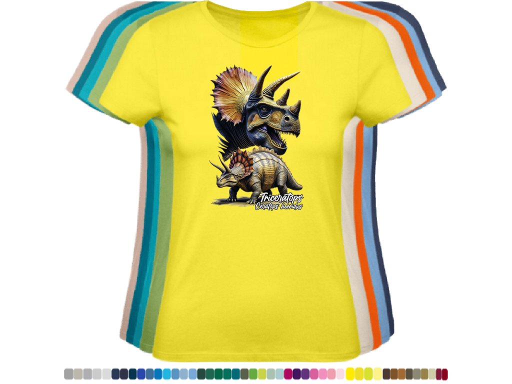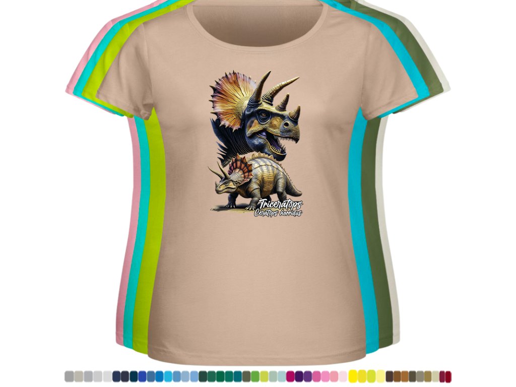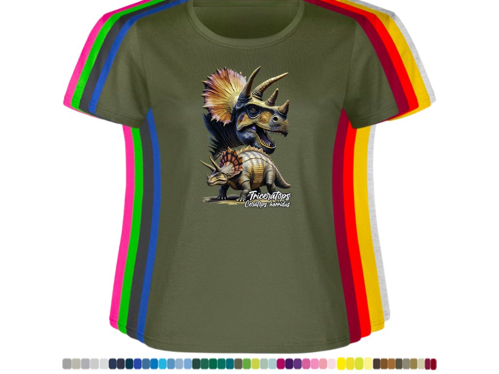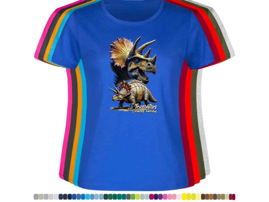 DÁMSKÉ LEVNÉ BAVLNĚNÉ TRIČKO S DIGITÁLNÍM POTISKEM DINOSAURA TRICERATOPS