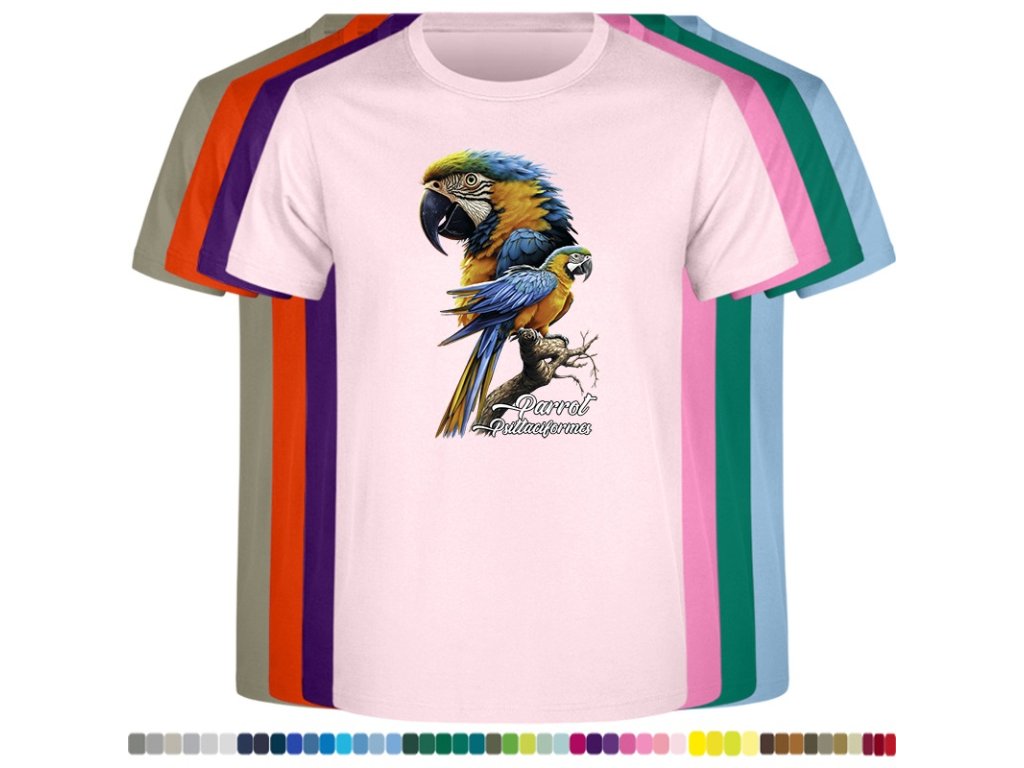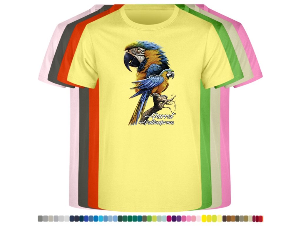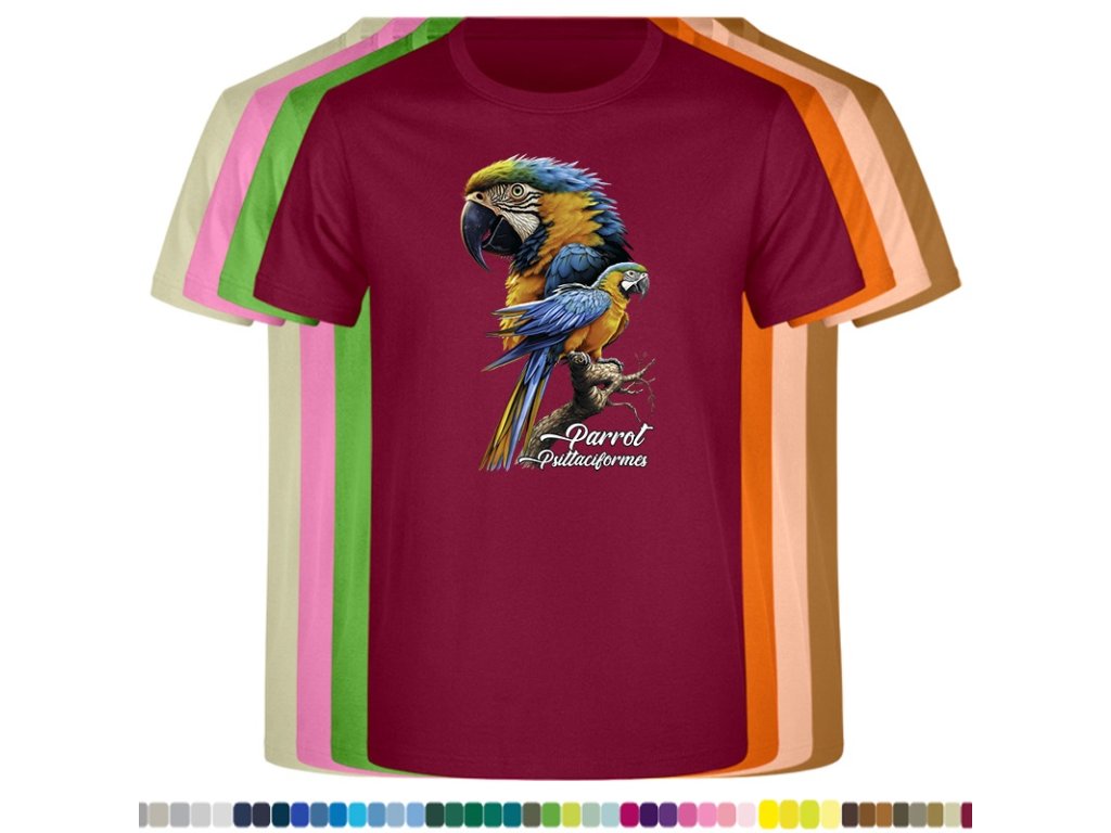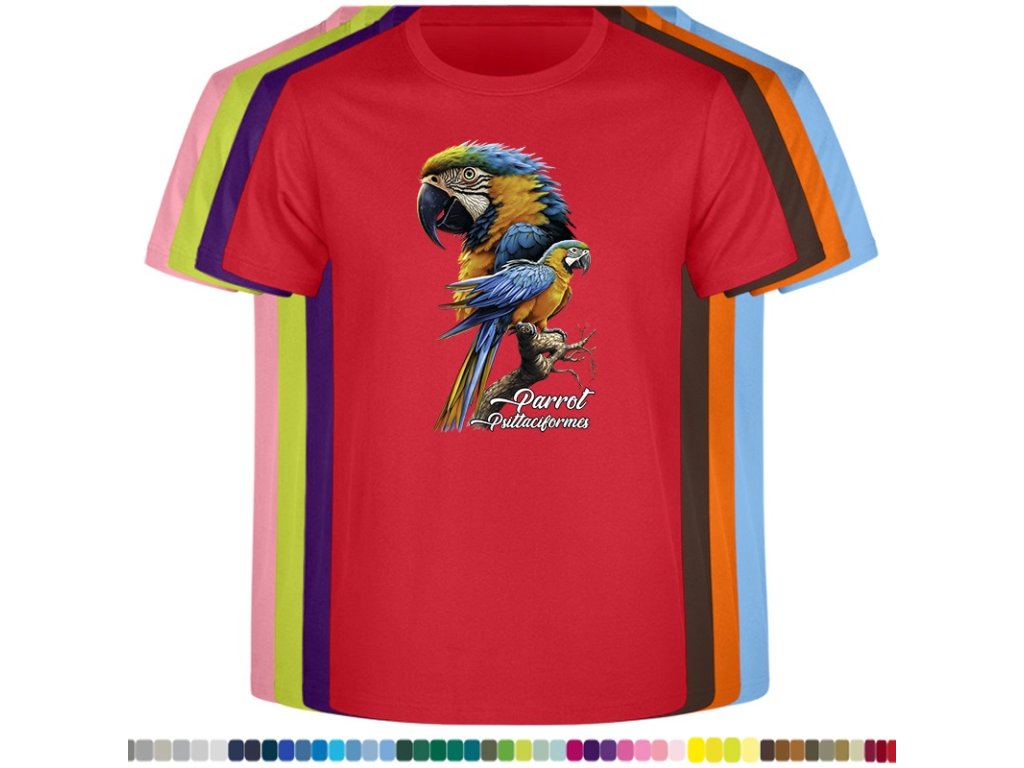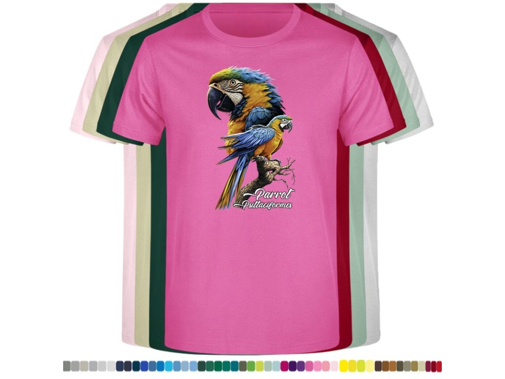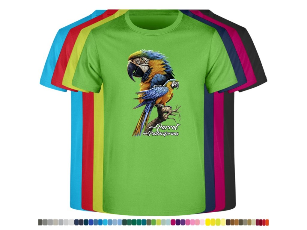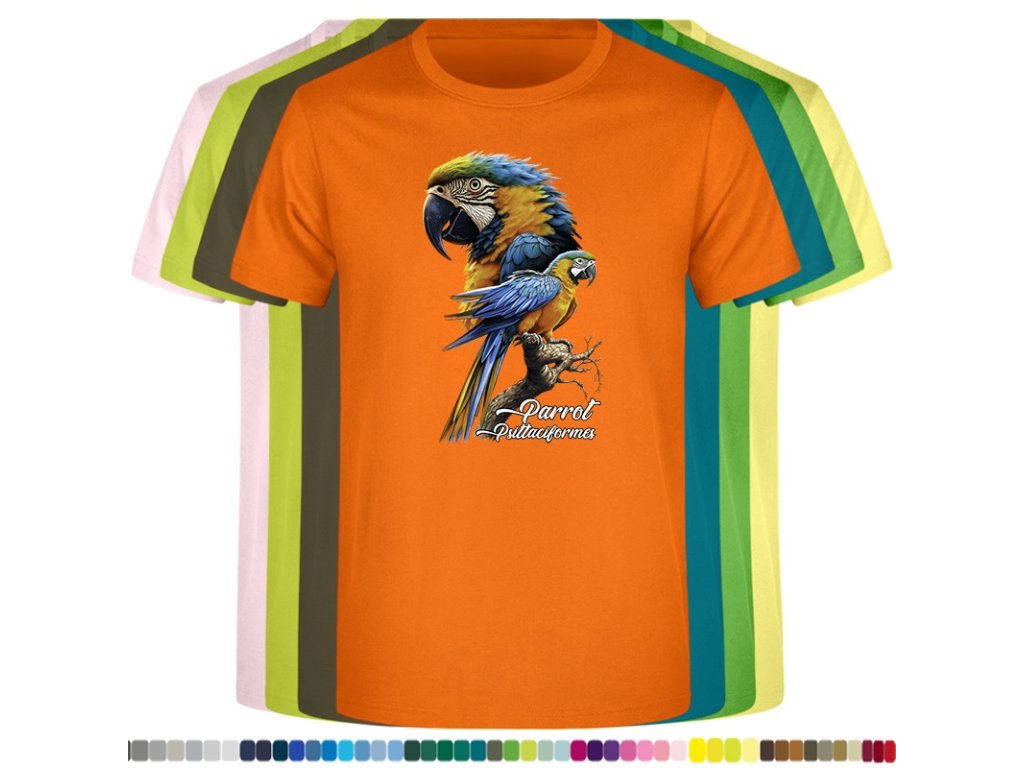 DĚTSKÉ LEVNÉ BAVLNĚNÉ TRIČKO S DIGITÁLNÍM POTISKEM PAPOUŠEK MODROORANŽOVÝ